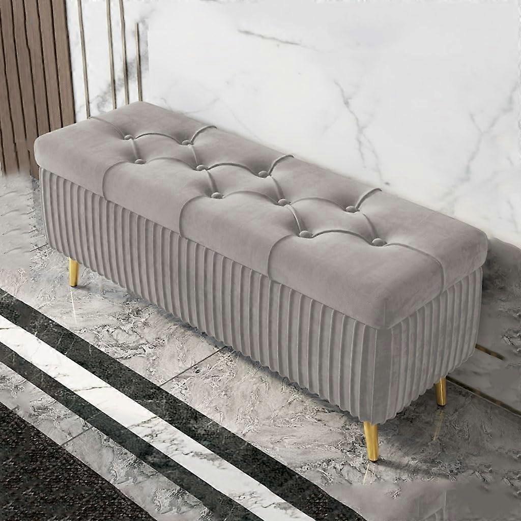 Velvet Storage Ottoman Bench with Padded Seat and Gold Legs for Bedroom or Entryway, Light Grey 120cm