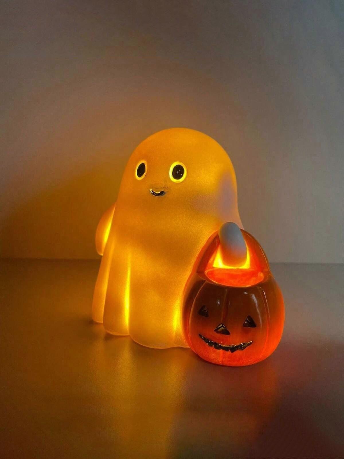 Cute Ghost Figurine with Pumpkin Bag - Luminous Resin Ghost Halloween Statue Desktop Ornament,For Halloween Decoration