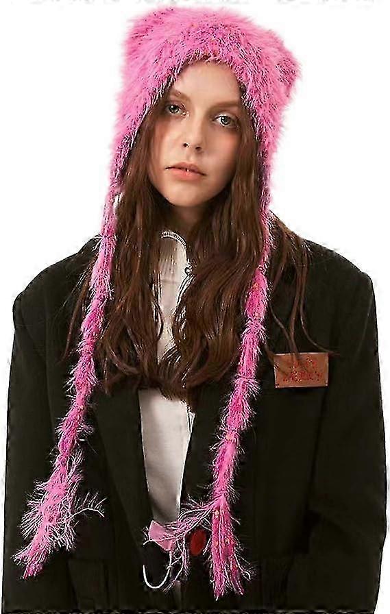 Y2K Fuzzy Winter Beanie with Distressed Knit and Cat Ear Design