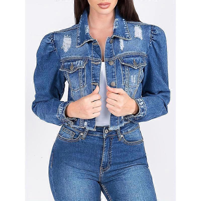 Women's Chic Blue Denim Jacket with Puff Sleeves - Casual Distressed Crop Top, Rayon & Polyester Blend, Machine Washable, for Spring/Fall