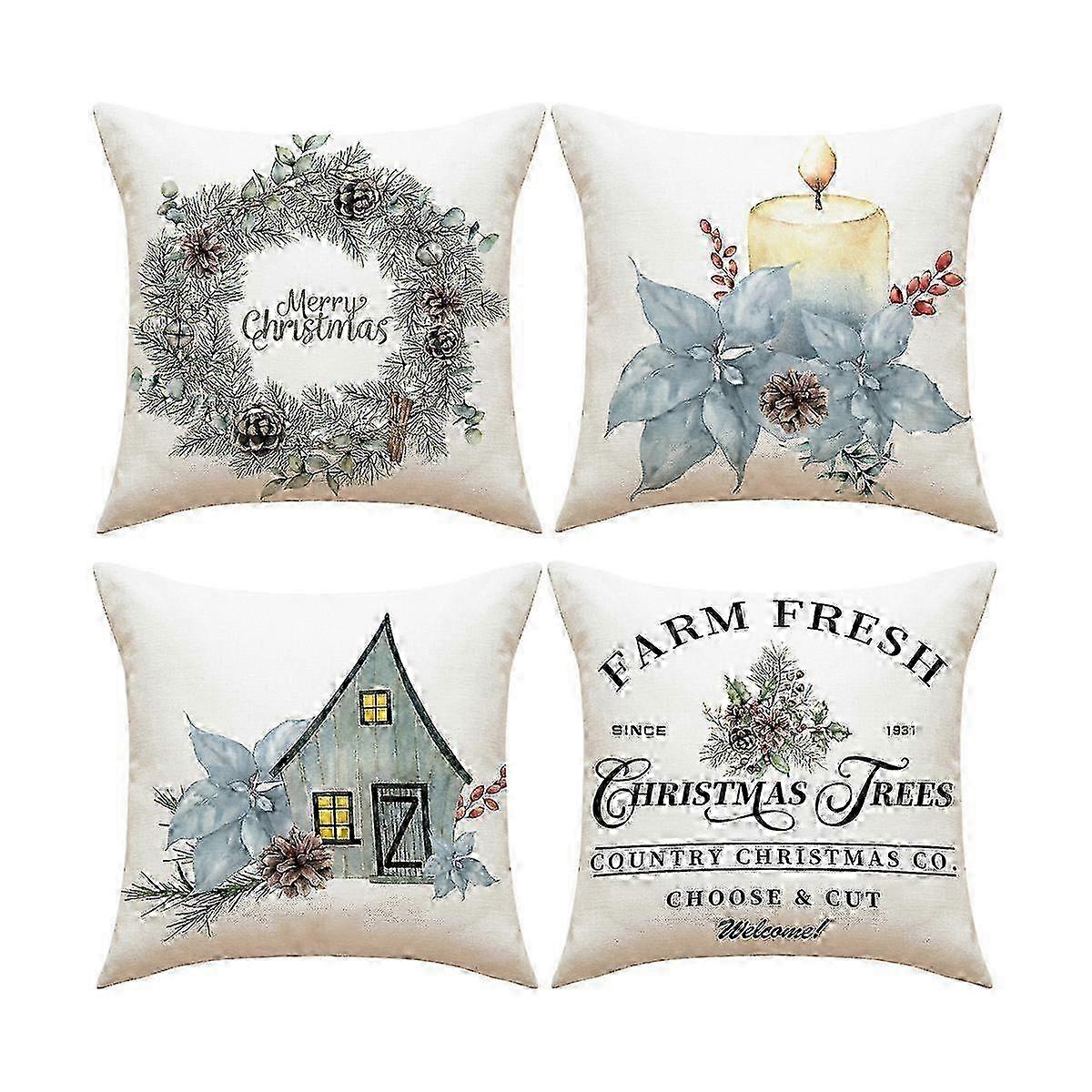 x Farmhouse Style Linen Throw Pillow Cover, Christmas Pillow Cover with Garland Decorative Prints, Reusable After Washing, Invisible Smooth Zipper