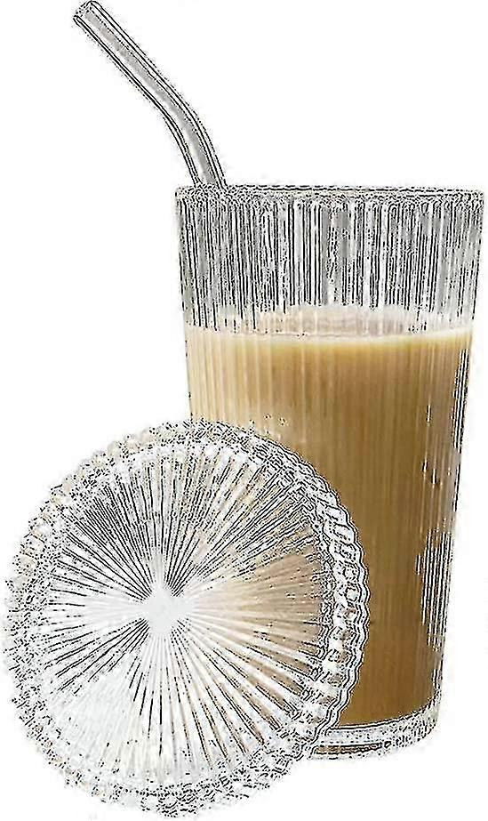 x Glass Cups With Lids And Straws, 375ml Ribbed Vertical Striped Glass Coffee Mug, Glass Tumbler For C