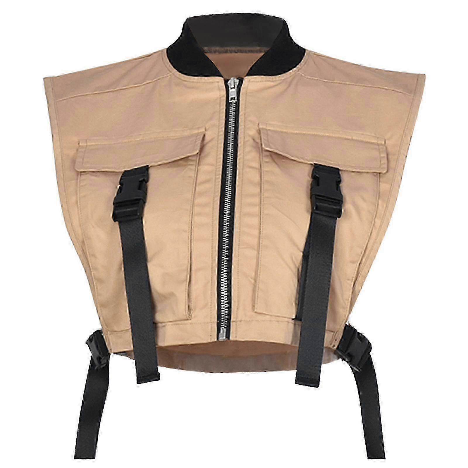x Womens Sleeveless Cropped Cargo Vest Solid Color Buckle Front Bandage Zipper Up Waistcoat Jackets with Flap Pockets S Khaki