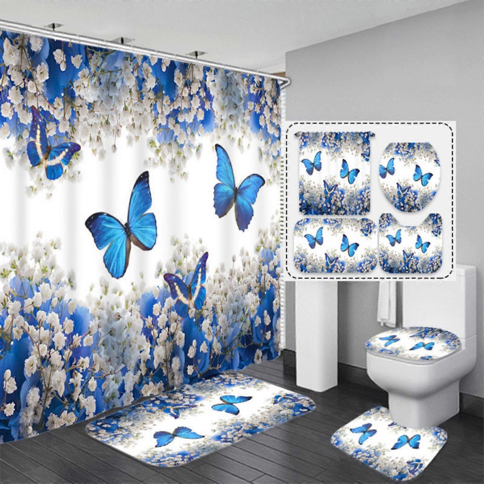 4 Pcs Farmhouse Shower Curtain Sets with Rugs, Blue Butterfly & White Cotton Flower Bath Curtain, 12 Hooks, Compatible with Standard Showers
