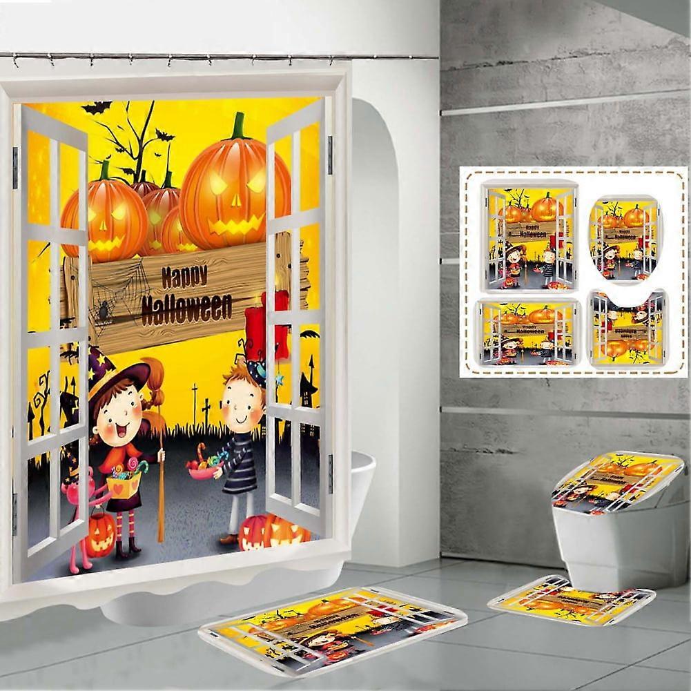 4Pcs Halloween Shower Curtain Set with Non-Slip Rugs, Toilet Cover & Bath Mat, Horror Pumpkin Design, 12 Hooks, Waterproof, compatible with standard