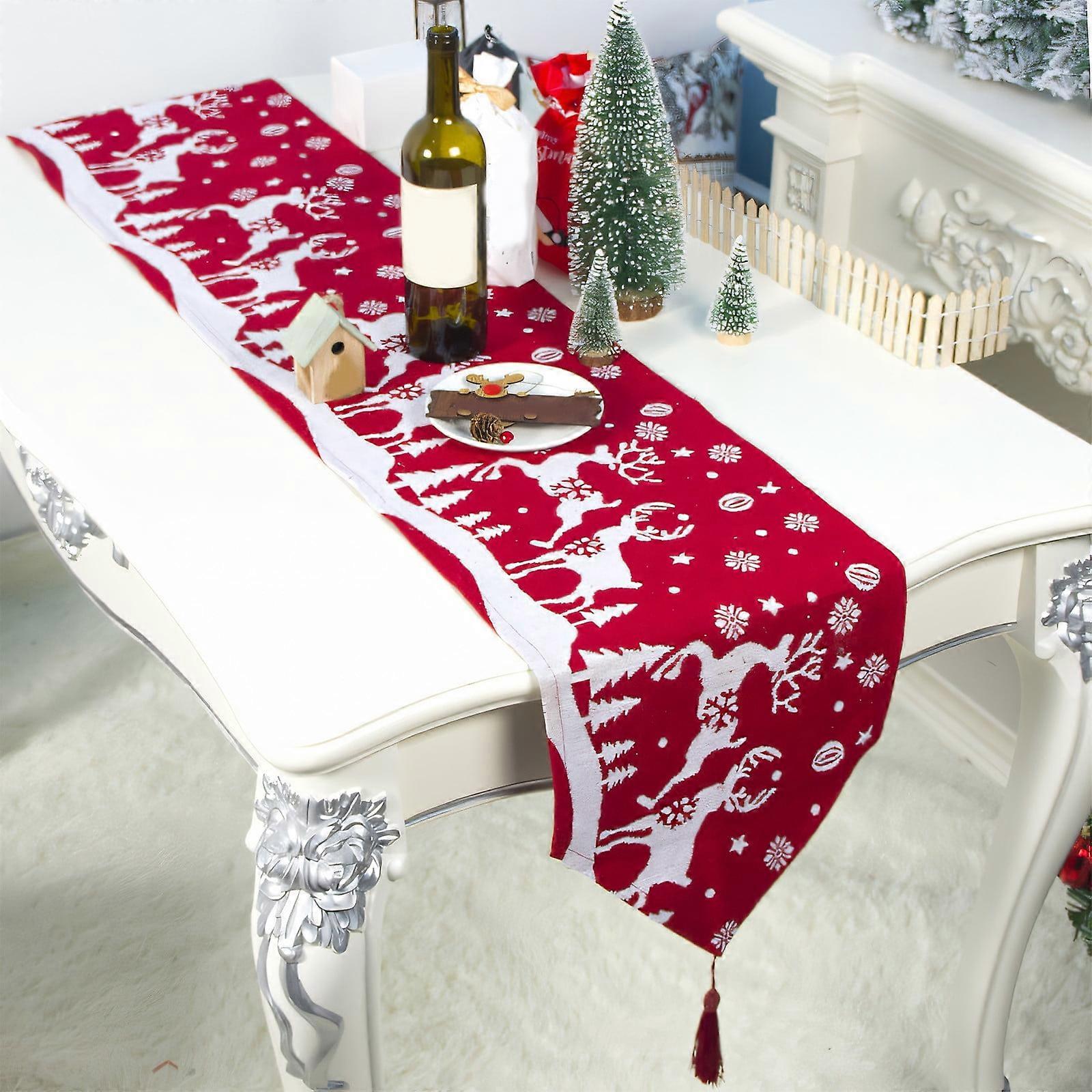 Christmas Table Runner Red with Reindeer & Tassels, Winter Dining Decoration, Compatible with Nordic Home Dinner Party