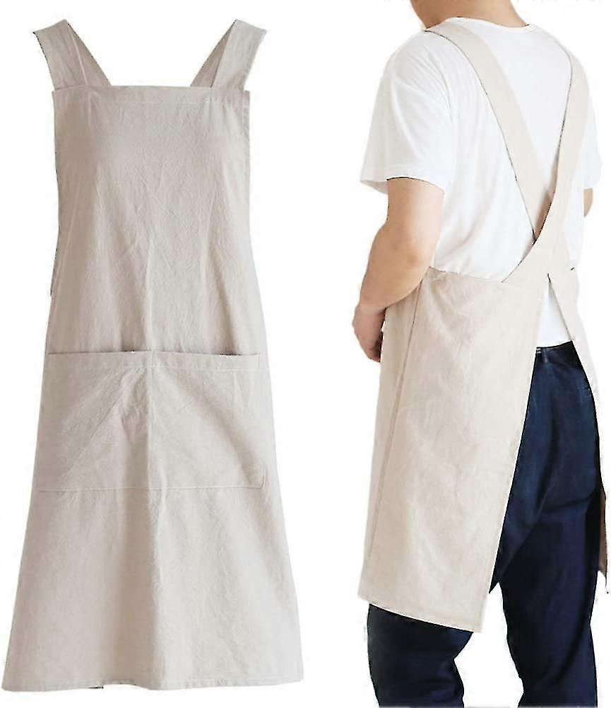 Linen crossback kitchen cooking apron for men with pockets for baking, painting, gardening, and cleaning.