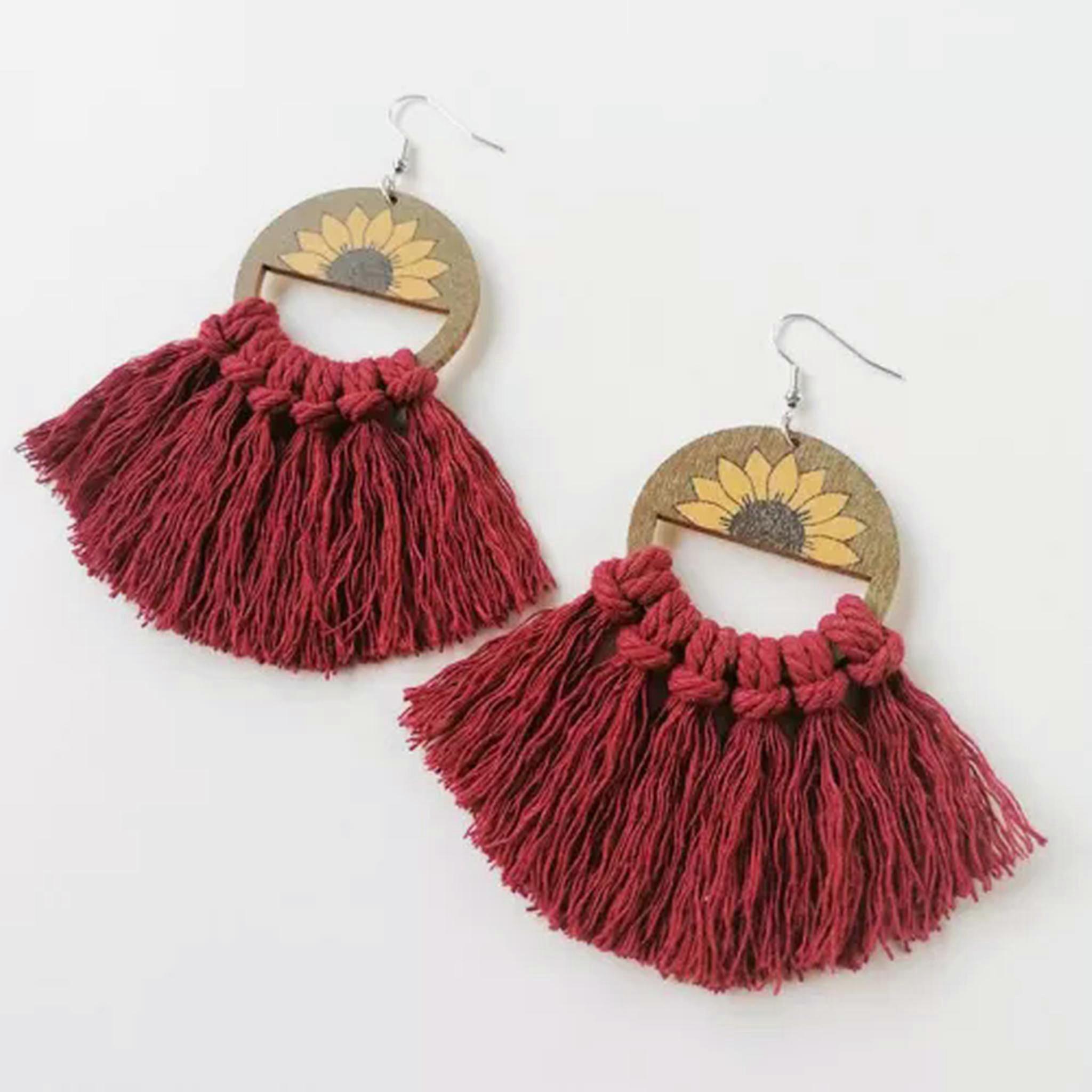 RSAMD Bohemia Morandi Leopard Wood Cotton Fringe Tassel Statement Earrings for Women-C6