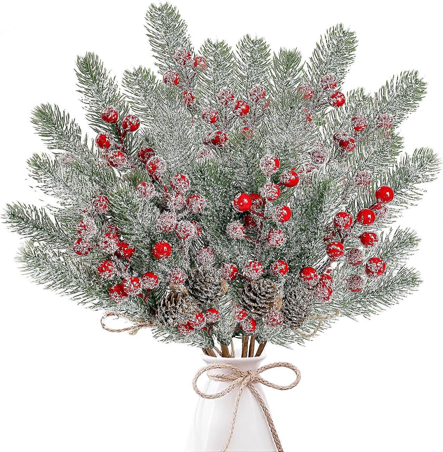 8 Pack White Snow Frosted Christmas Berries Pine Picks, Artificial Pine Branches with Pine Cones for Xmas Tree, Wreath, DIY Craft, Holiday Decor