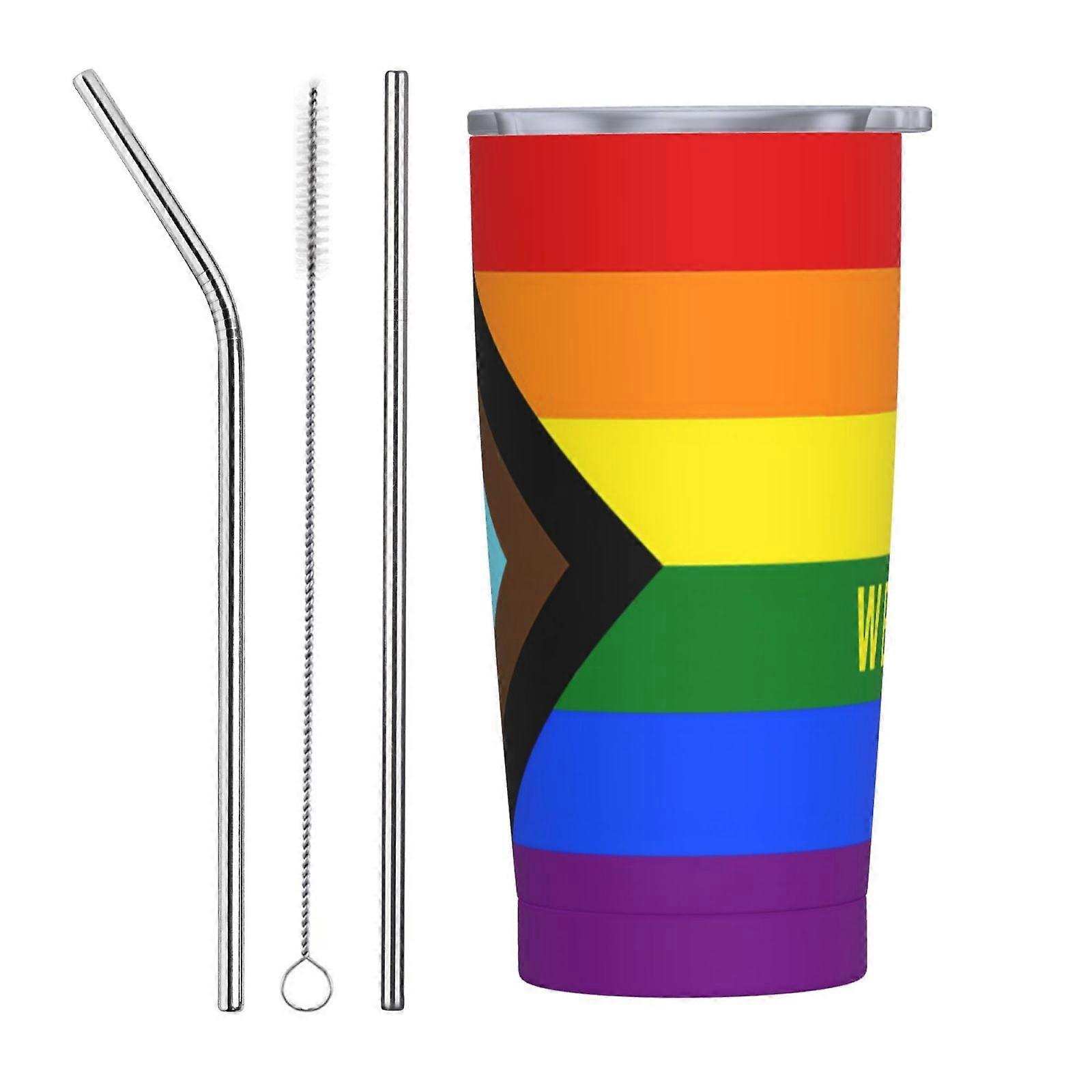 Progress Pride Flag 20 oz Insulated Stainless Steel Travel Mug with Straw - LGBTQ Rainbow Thermal Cup, Portable Three-Piece Set