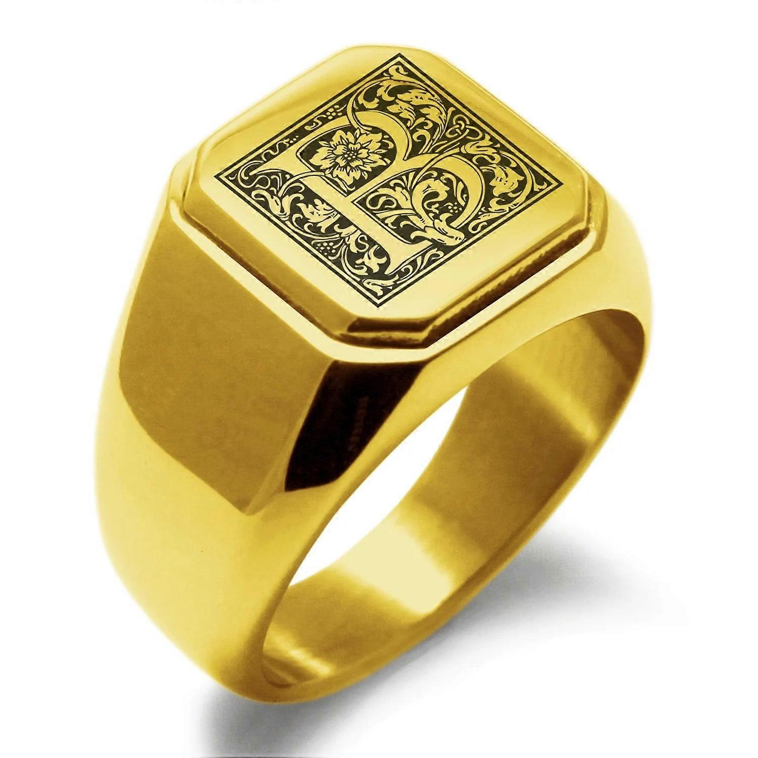 Tioneer Stainless Steel Letter B Initial Floral Box Monogram Engraved Male Square Flat Top Adult Biker Style Polished Signet Ring