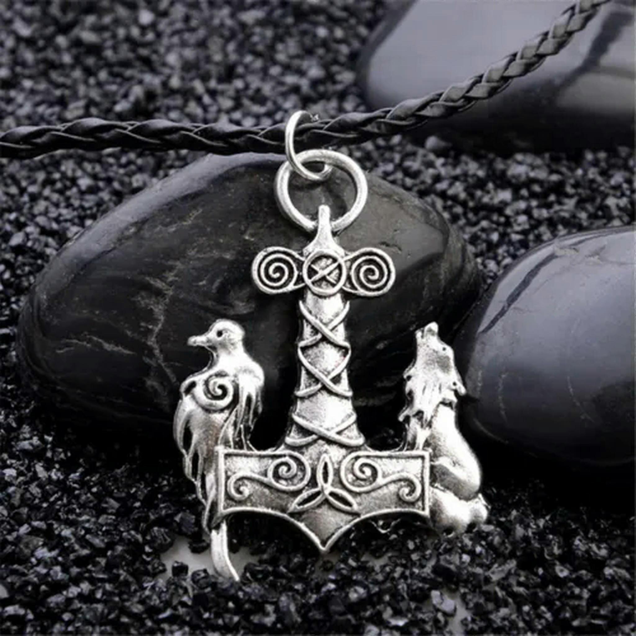 RSAMD Mens Nordic Viking Mjolnir Wolf Crow Pendant Chain Myth Thor's Hammer Necklace-silver