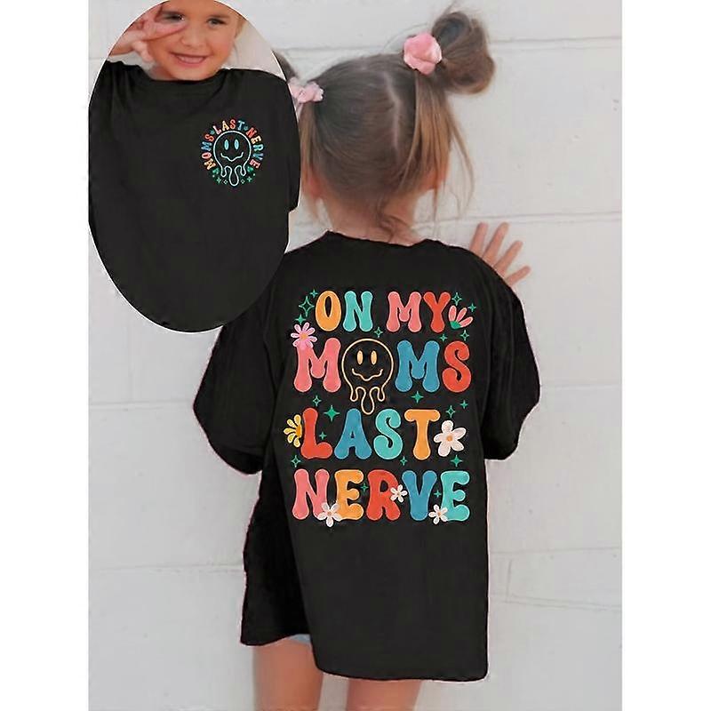 ON MY MOM's LAST NERVE Fun Graphic Print Girls' Cotton T-Shirt - Casual Short Sleeve Summer Tee with Playful Handprint & Flower Design