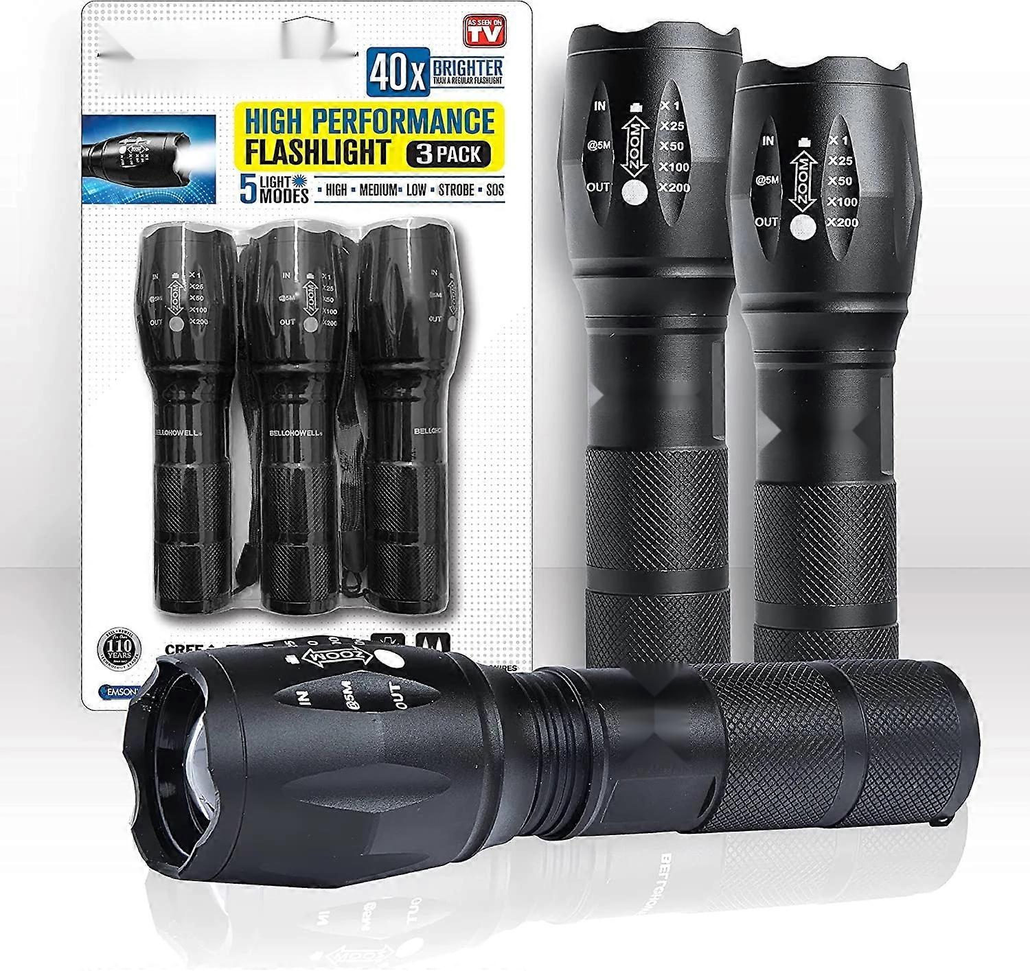 Flashlight with 5 weather resistant light modes, 40x brightness, 3 packs, 1 pound, as shown on the TV