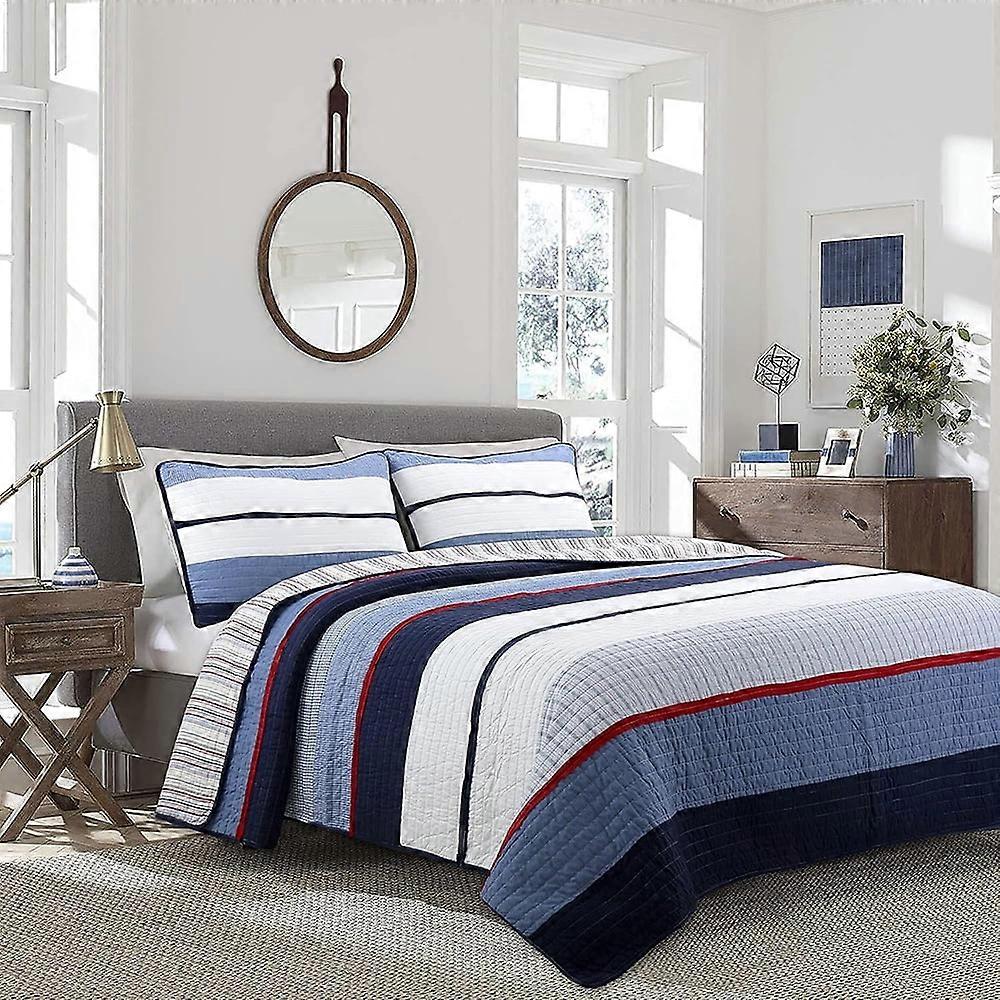2-Piece Reversible Quilt Bedding Set, 100% Cotton Navy Blue Red Striped Boy Coverlet, Bedspread for Bedroom, Apartment - Twin