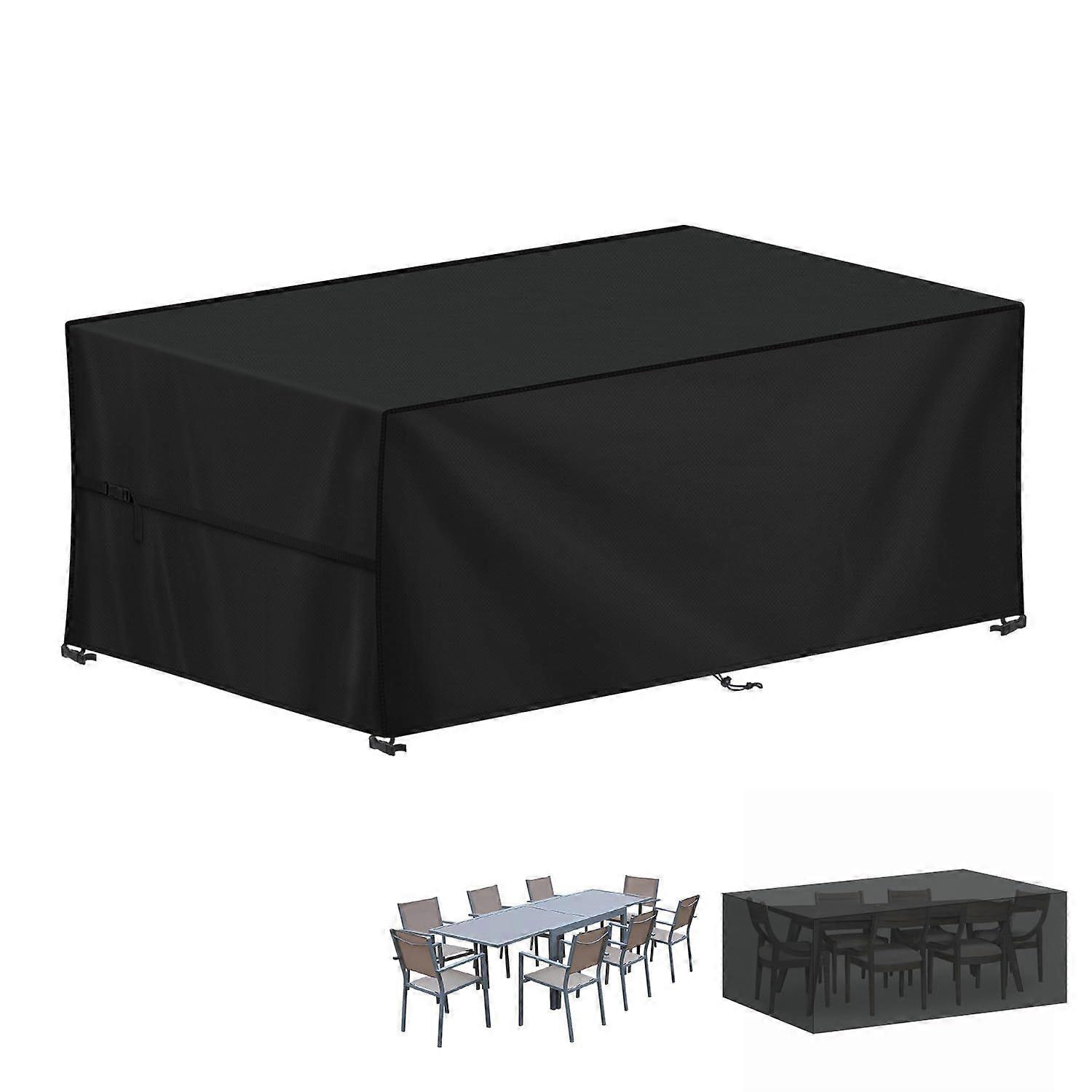 Waterproof and Anti-UV Table Cover: Garden table covers are coated with a thick PU coating, which is UV resistant and provides exceptional protection against sunlight. Additional waterproof tape is added to the top seams to prevent rainwater from seeping through. The all-weather design provides complete protection for your furniture and cushions against scratches, dust, moisture, rust, rot and mildew. Ventilated and Tear-Resistant Material: This heavy-duty garden furniture cover is made of upgraded high-density 420D Oxford fabric, which is thicker and more durable than many other common 420D outdoor covers; Double-stitched edges increase tear resistance and effectively prevent tears and cracks, ensuring long-term use of this outdoor patio furniture cover. Upgraded Windproof Design: In addition to the standard four corner buckles and two bottom drawstrings, there are two additional adjustable reinforcement straps on the short sides of our patio furniture cover, which can ensure great stability even in strong winds and keep your sofa or chair and table set in the best condition and ready to use all the time. Multiple Sizes Available: This rectangular table cover measures 200x100x75cm, suitable for most types of indoor/outdoor furniture, tables and chairs, dining sets, seating sets, picnic tables, benches and rectangle sofa. We have different sizes of patio furniture covers to meet your needs, please measure the dimensions of your furniture set before purchasing, especially the depth of the chairs. Easy to use, clean and store: The large flat opening allows one person to cover and store the cover independently (storage bag included). When using the cover, it is recommended to place round objects under the cover to raise the middle part, so that water can drain down and not collect. This patio furniture cover is easy to clean, just rinse it with water and dry it in the sun.