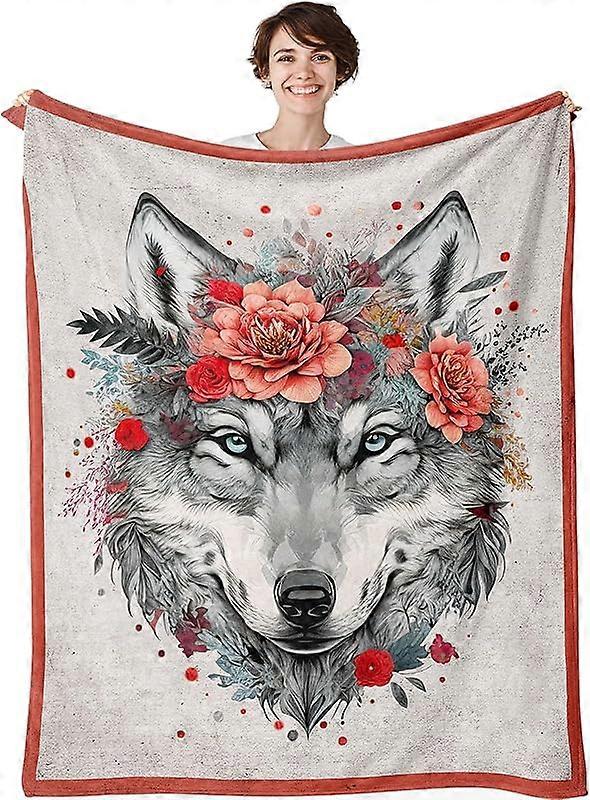 Wolf with Flowers Blanket Wolf Fleece Warm Throw Blanket for Women Men and Kids 350gsm Super Soft Plush Wolf Decor 60x80inch