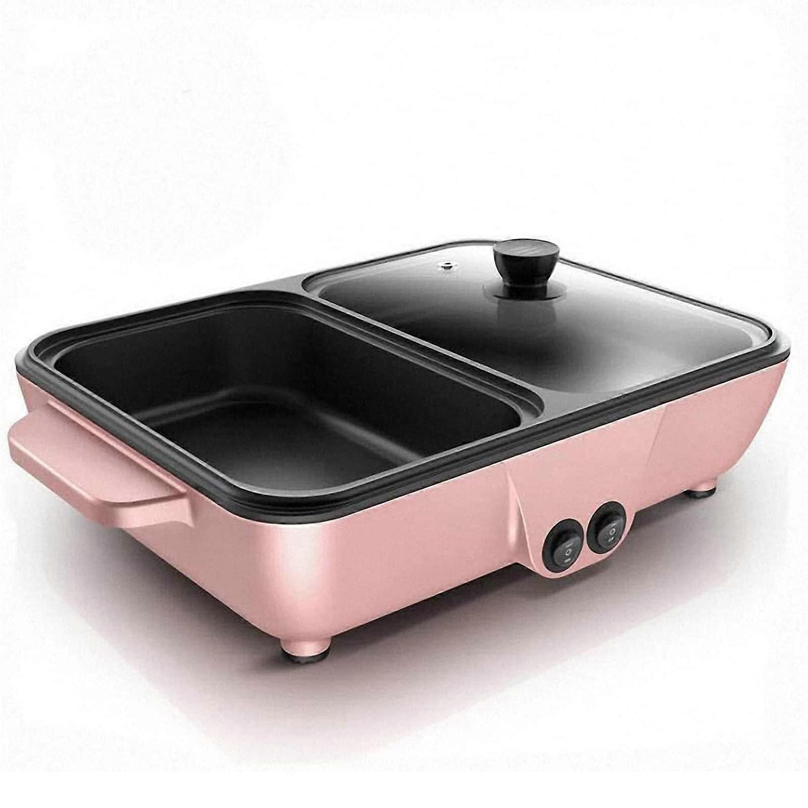Electric Grill and Hot Pot 2in1 Cooker with Lid, Nonstick Surface, Dual Flavor Divider, Pink