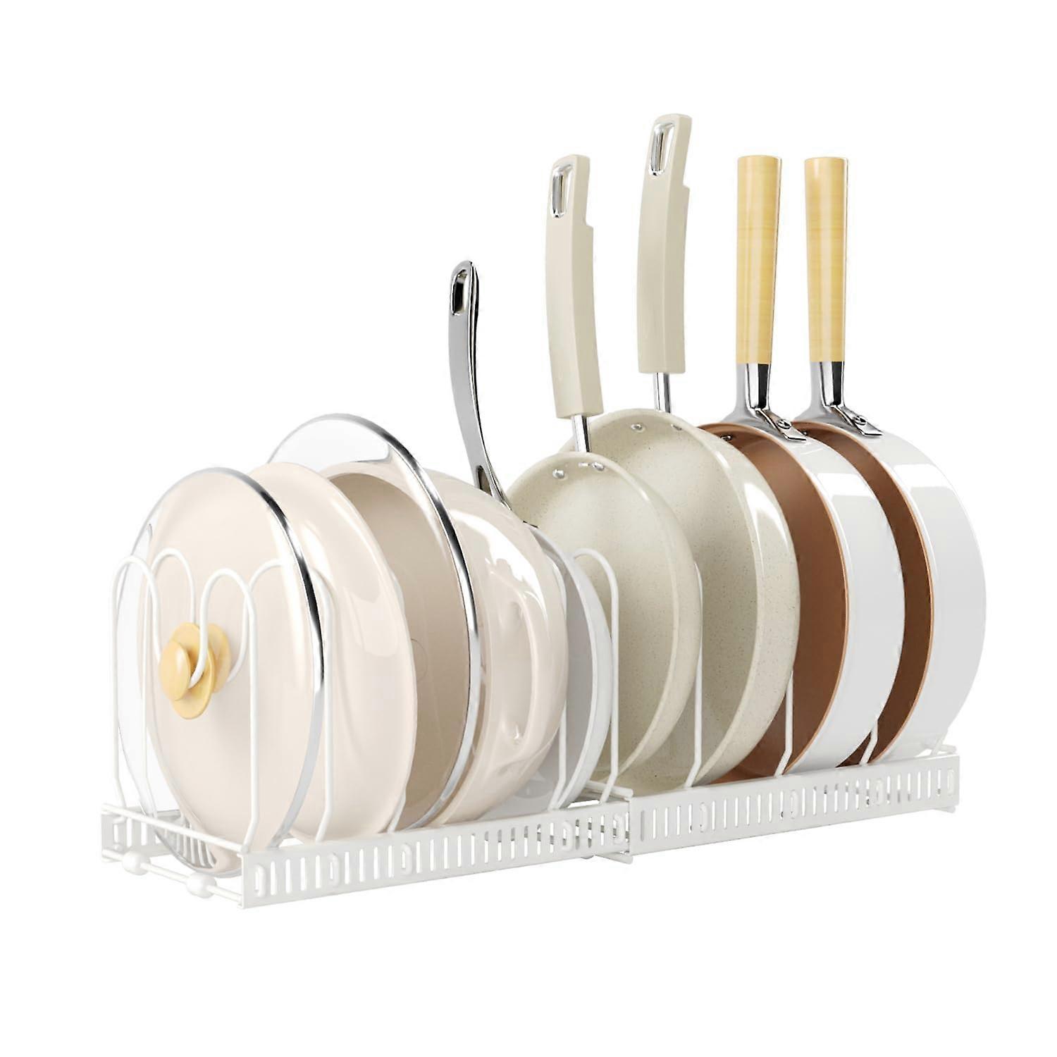 Expandable Pots and Pans Organizer Rack with 10 Adjustable Dividers for Kitchen Cabinet Storage, White