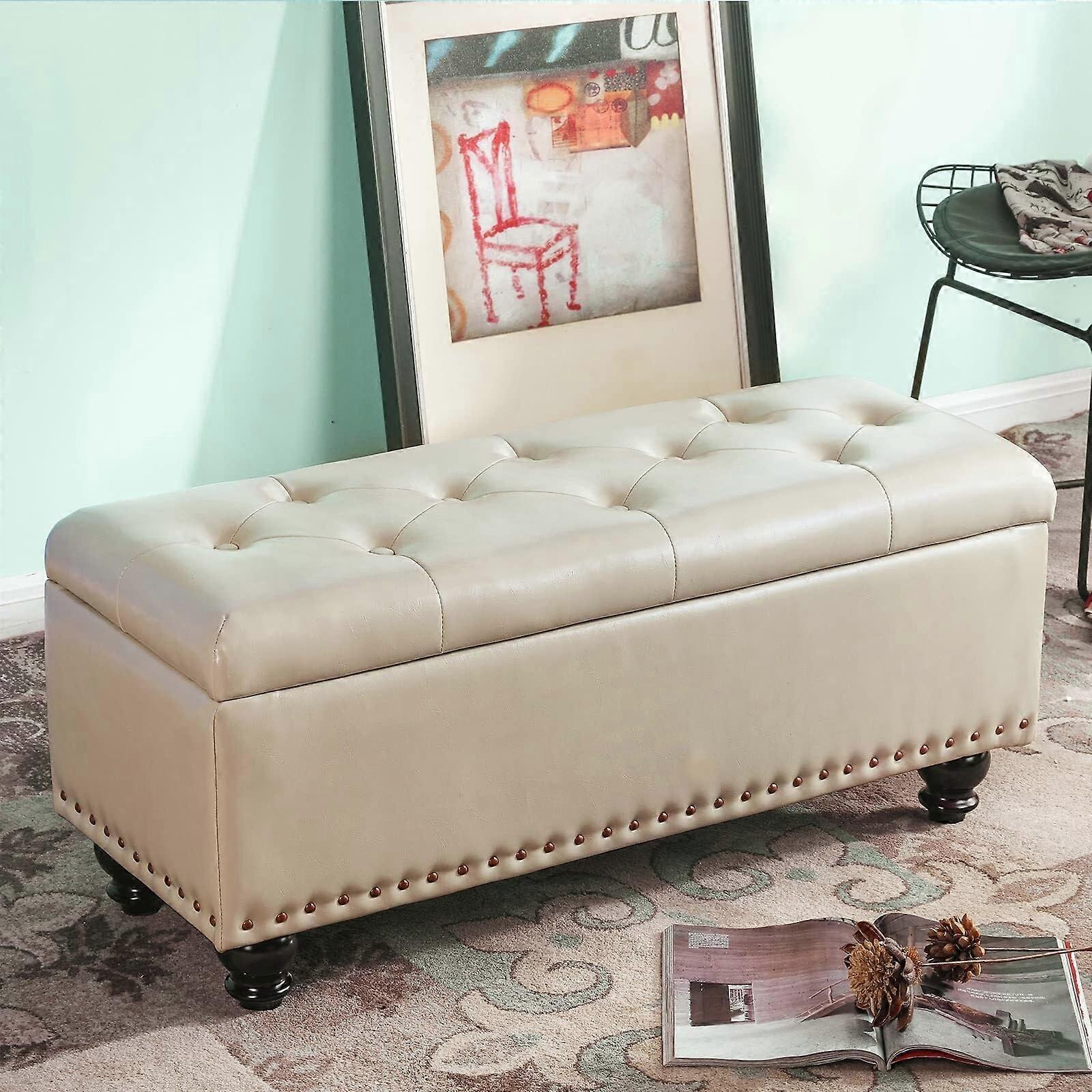 Leather Storage Bench with Wooden Legs, Button Tufted Ottoman for Bedroom, Entryway and Living Room