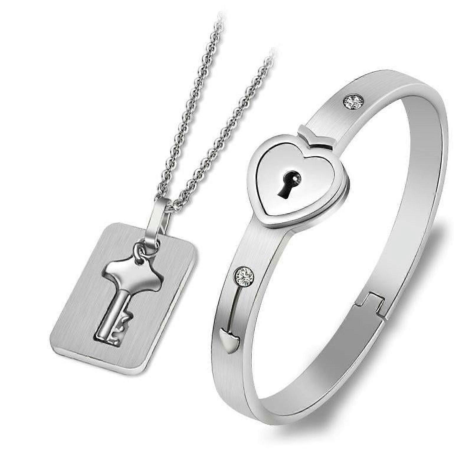 Fashion Concentric Lock Key Titanium Steel Jewelry Set, Bracelet & Necklace Couple Gift for Valentine's Day, Wedding Anniversary