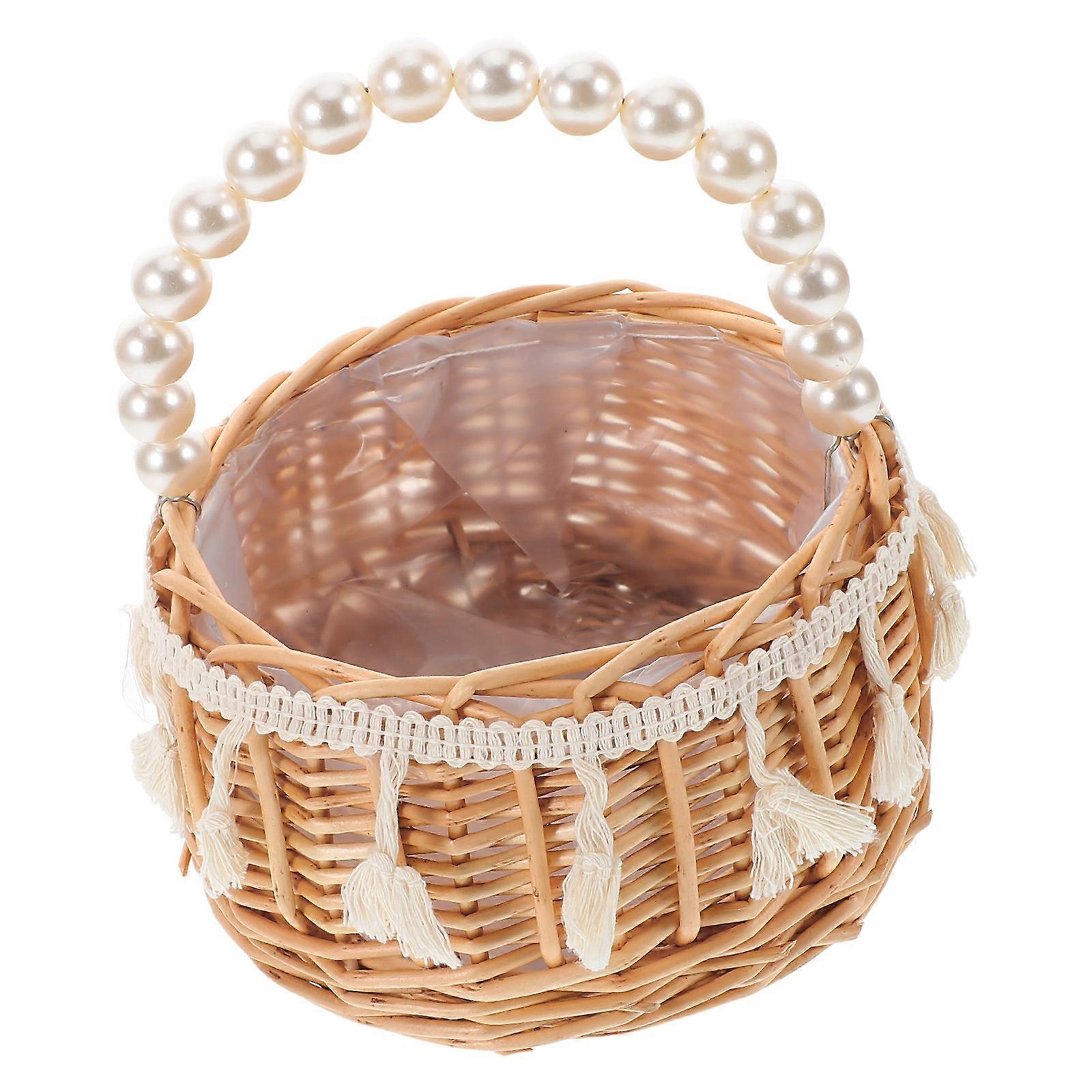 Wicker Flower Girl Basket With Simulation Pearl Handle Small Woven Container For Weddings Round Handle 20.00X16.50X16.50CM 1Pack