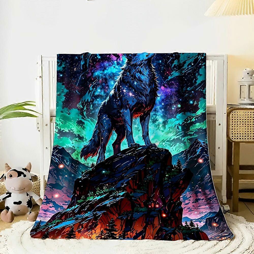 1pc Wolf Howling at Moon Flannel Blanket - Dark Blue, Purple, Red, Black Cosmic Night Sky Design - All-Season Sofa, Bed,-AZXCM413