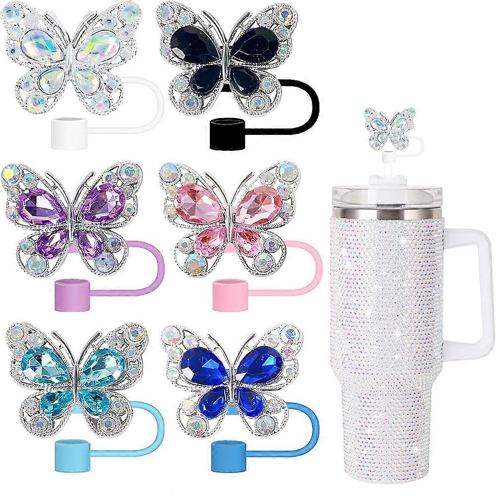 6pcs Shiny Straw Toppers, Colorful Diamond Butterfly Straw Covers Cap for Stanley Tumbler Cups 30&40oz Tumbler with Handle