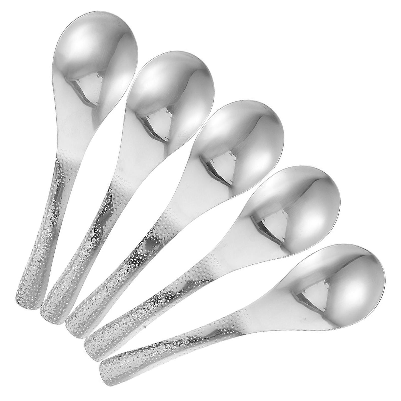 The hammered texture of these stainless steel spoons not only adds visual appeal but also offers a non-slip grip, making them practical for both home and kitchen settings. Their round-bottom design is ideal for serving a variety of dishes, ensuring that each scoop is effortless and precise. Features -Color:Silver -Material:Stainless Steel -Size:15.00X4.10X3.00cm/5.89X1.61X1.18in -Sturdy quality: made from stainless steel, these spoons are designed to withstand daily use without losing their shine -Textured handle: the hammered design on the handle provides a secure grip, preventing the spoon from slipping during use -Adaptable design: the round bottom makes these spoons suitable for various types of dishes, from soups to salads -Ideal for home and dining: these spoons are ideal for both home kitchens and restaurant dining, offering versatility and style -Convenient set: includes 5 spoons, ideal for serving multiple guests or family members at once Package list: 5 x stainless steel spoon