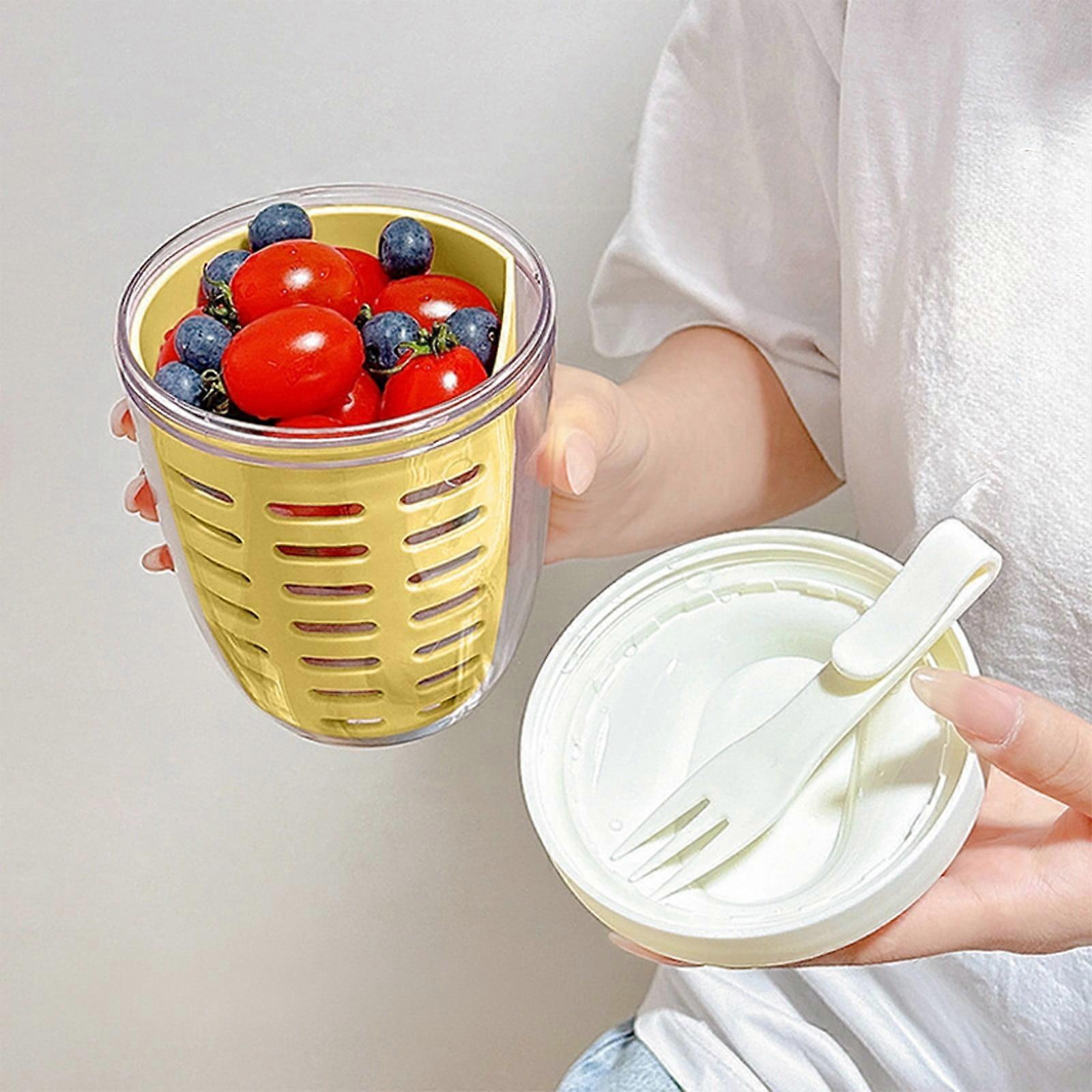 Fruit Slaw Storage Cup With Lids And Fork Plastic Food Storage Container Set With Airtight Lids For Kitchen Office Party Camping: Features: WIDELY USE: 650 ML Fruit Cup with Lid and Fork, Overnight Oats Container Fruit and Vegetable Slaw Cups, great for dieters to control their food intake, can be used to carry fresh fruit outdoors for picnic camping, make homemade overnight oats, store grains, jams, canned fruit, keep food fresh for a long time. UNIQUE DESIGN: It consists of inner and outer cups as well as a fork, the inner cup is hollowed out and comes with a fork that can be stored directly in the lid, which is cleaner and more hygienic, you don't have to worry about spoons slipping off or missing the convenient storage space. FRESHNESS:Each container can hold of food to meet your fruit breakfast needs. In addition, the sealable lid with silicon ring ensures that your food stays fresh in the fridge, allowing you to enjoy fresh fruit whenever you want and delicious overnight oats in the morning. Great MEAL PREPARATION AND STORAGE: These containers are suitable for storing fresh fruit, overnight oats, but also for storing and carrying other foods such as yogurt, and so on. They are great for breakfast to go whether you are at work, school or traveling. GOOD GIFT: Fruit Cups with lids and forks, overnight oats containers, both at home and at work. For Christmas, birthdays or other important holidays, this is a great present for someone important, parents, pals or any other relatives! Product Description: Product Quantity: 1 pc Colour :yellow Material: AS,Plastic,Sillicone Product Size: 13.4*10.3 cm/5.28*4.06 in Package size: 14*10*8 cm/5.51*3.93*3.14 in Net Weight :250 g/0.55 lb Gross Weight :250 g/0.55 lb Includes: 1* slaw cup Salad Container for Lunch with Fork Fruit Salad Storage Cup with Lids and Fork, Plastic Food Storage Container Set with Airtight Lids 20 oz BPA-Free for Kitchen, Office, Party, Camping ( Salad Container for Lunch with Fork, Fruit cups with Lid and Handle, Fruit Storage Containers for Fridge Keep Fresh, Food Storage Container Set BPA-Free for Kitchen, Office, Party, Camping Fruit Salad Storage Cup with Lids and Fork, 20oz Reusable Plastic Fruit Storage Containers for fridge with Drain Baskets, BPA-Free & Leak-Proof, Keep Fruits,Vegetables Fresh Longer Portable Picnic Party Fruit Salad Storage Cup with Lids and Fork,20 Oz Fruit Storage Containers for Fridge with Removable Colander BPA-Free,Leak-Proof,Keep Fruits,Berry,Salad Fresh longer