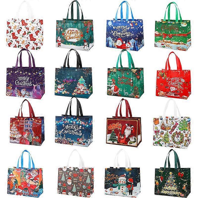 32 Pcs Christmas Gift Bags Set - 16 Unique Designs Waterproof & Thick Lining Merry Christmas Printed Party Favors Heavy-Duty Storage Tote Fo