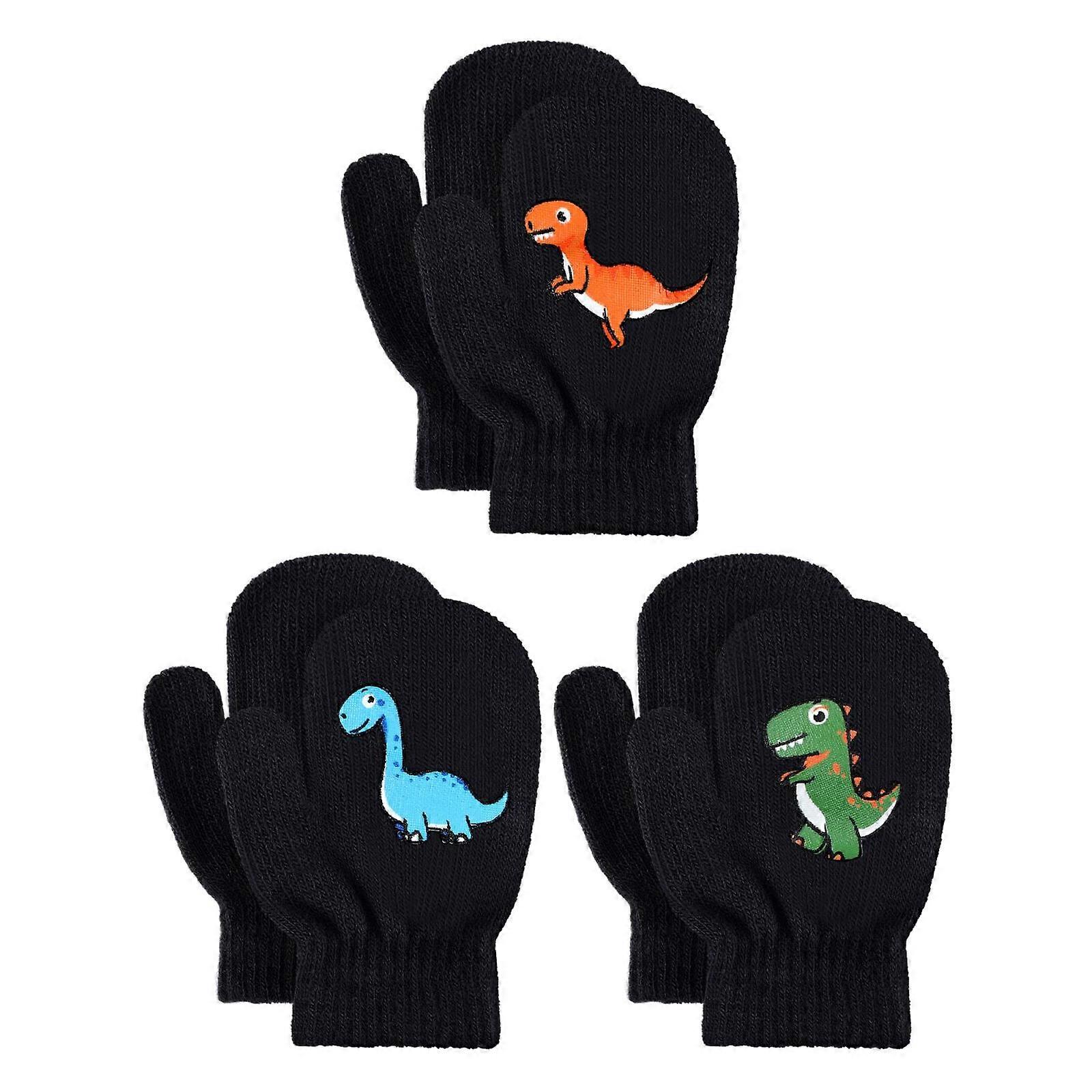3 Pairs Kids Dinosaur Mittens, Stretchy Knit Winter Gloves for Boys Girls, Cute Dinosaur Pattern Full Finger Toddler Mittens for Cold Weather Warmth