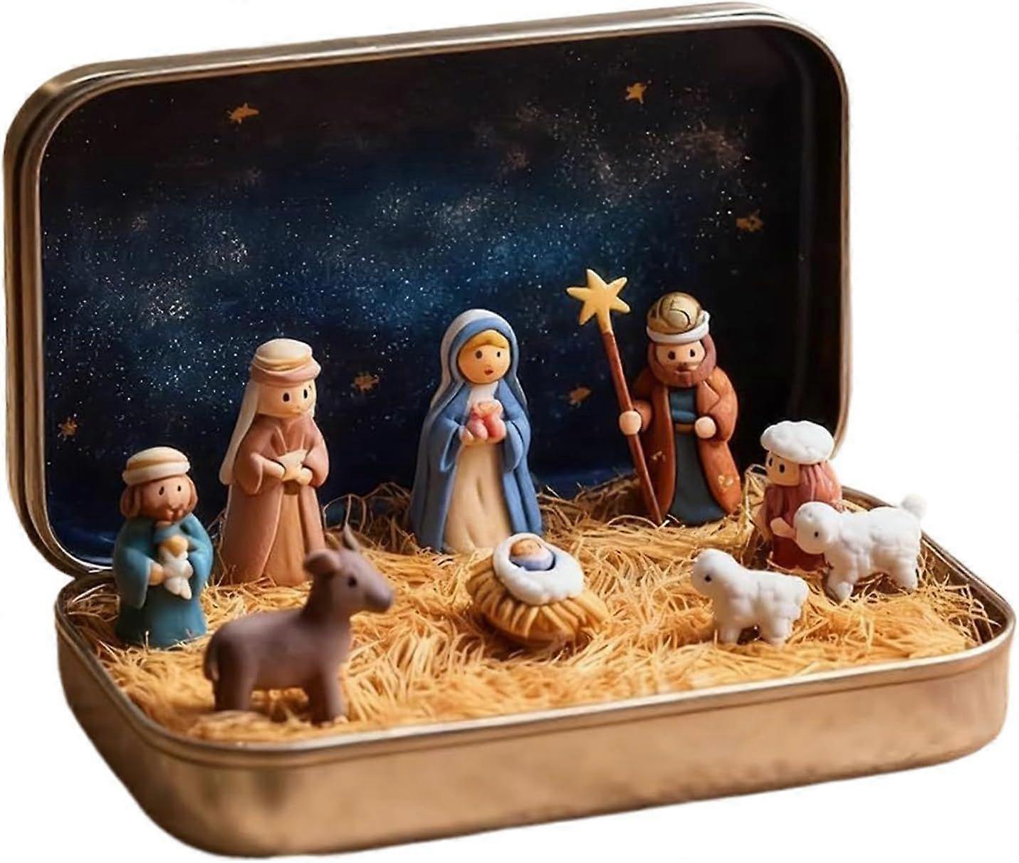 Handmade mini tin box Nativity scene - pocket-sized resin Nativity set of small statues, Christmas interior decoration and family gift (1 piece)