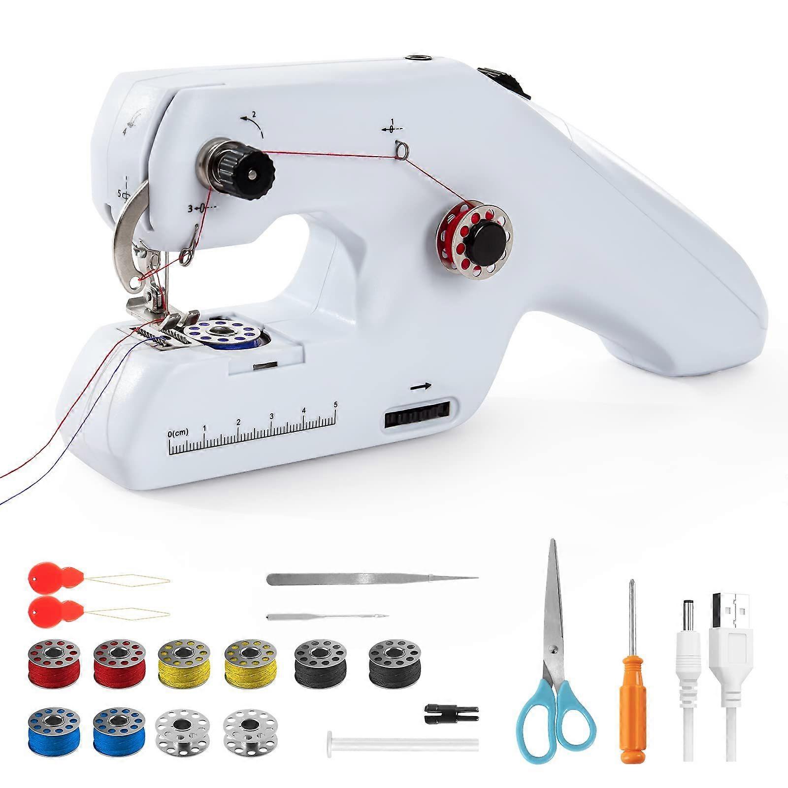 【Portable and fully automatic double line】This sewing machine is automatic two-thread sewing. It is not necessary to press the switch, the lower thread is stronger, which facilitates the whole sewing process. You don't have to worry about complicated operations anymore. 【Two power supply methods】This sewing machine is powered by 4 AA batteries (not included) or 6V power supply (including USB cable ). Note: The USB cable is only used for power supply, not for charging. Pay attention to the installation of the battery. Improper installation method will prevent the portable sewing machine from working. 【Good helper at home】It can be used to sew wall curtains, small DIY items, personal clothes, etc. . It is suitable for dense non-elastic fabrics such as cotton, linen, denim, wool, felt, canvas, etc. Your life will become easier and simpler. 【Lightweight and Compact】The handheld sewing machine is lightweight and portable, you can take it with you anywhere. If you encounter any broken clothes during the trip, you can use our sewing machine to repair them immediately, and it won't take up your extra space. 【Perfect for Beginners】 The threading steps of the sewing machine have been carried out before shipment. You just need to power the sewing machine, then you can easily start sewing. If you have any doubts during use, you can refer to the manual.