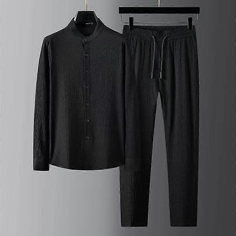 Spring Summer Seersucker Suits Men Long Sleeve Casual Shirts Pant Two-piece Set