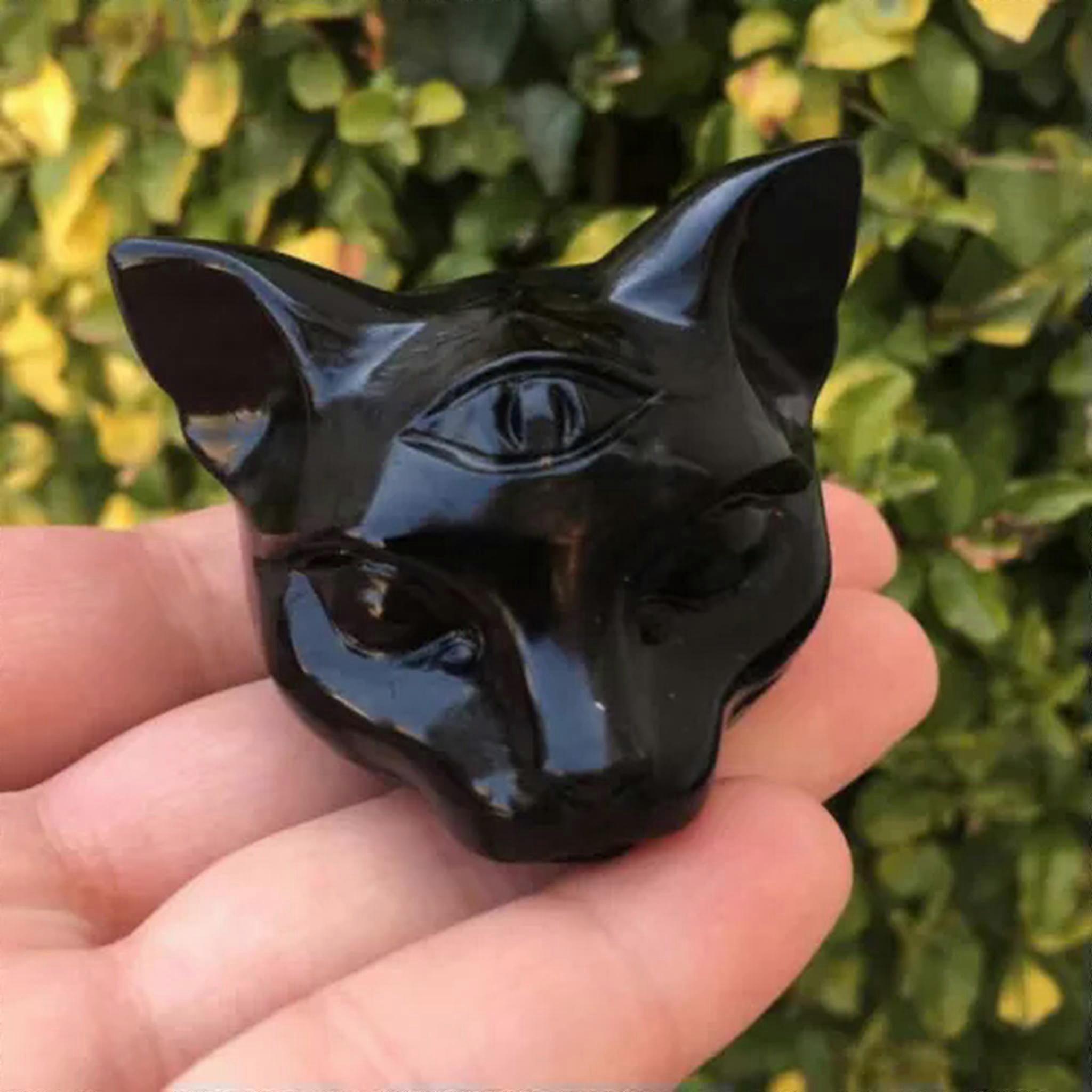 RSAMD Natural Hand Carved Crystal Three-eyes Cat Head Skull Quartz Reiki Figurine Gift-Obsidian-1PC (Random Pick)