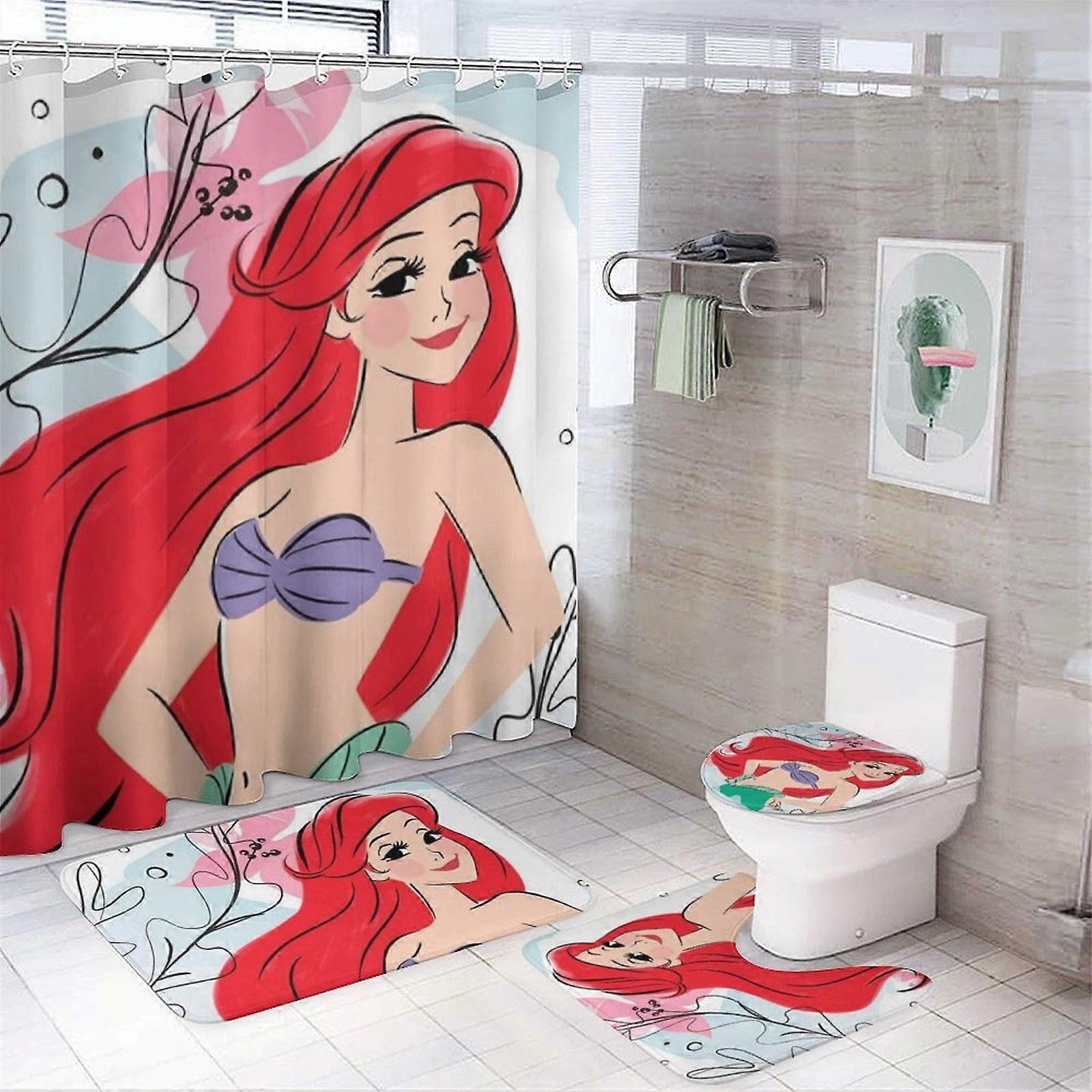 Little Mermaid 4-Pc Shower Set w/ Non-Slip Rugs, Toilet Cover & Bath Mat, Cartoon Kid's Waterproof Curtain + 12 Hooks, 72"x72"