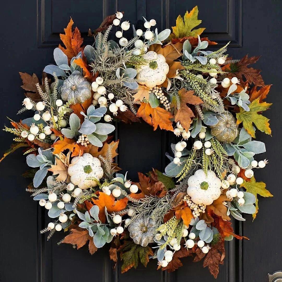 Autumn Pumpkin Wreath With Berries And Maple Leaves, Fall Door Decor For Halloween, Harvest Season, Porch, Entryway Home Decor