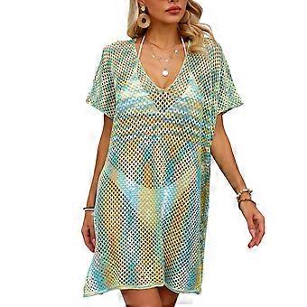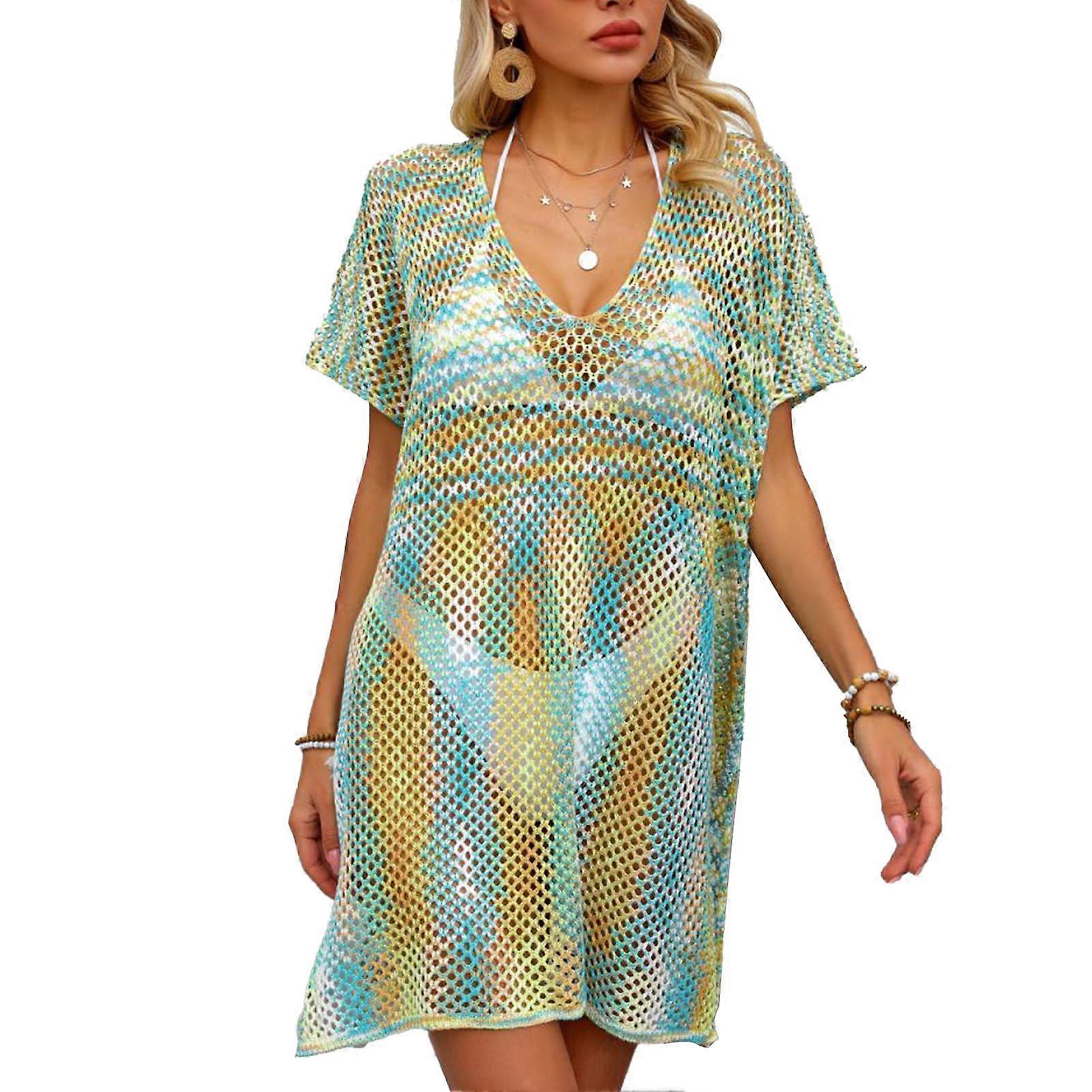 Hollow Out Beach Coverup V Neck Short Sleeve Crochet Swim Lake Blue