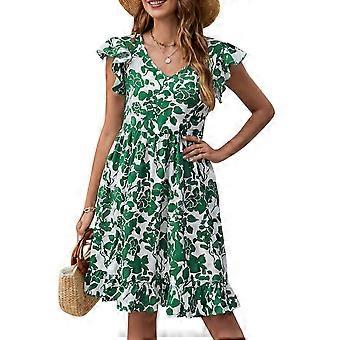Women Leaf Printed Ruffle Cap Sleeve V Neck Dress Green L