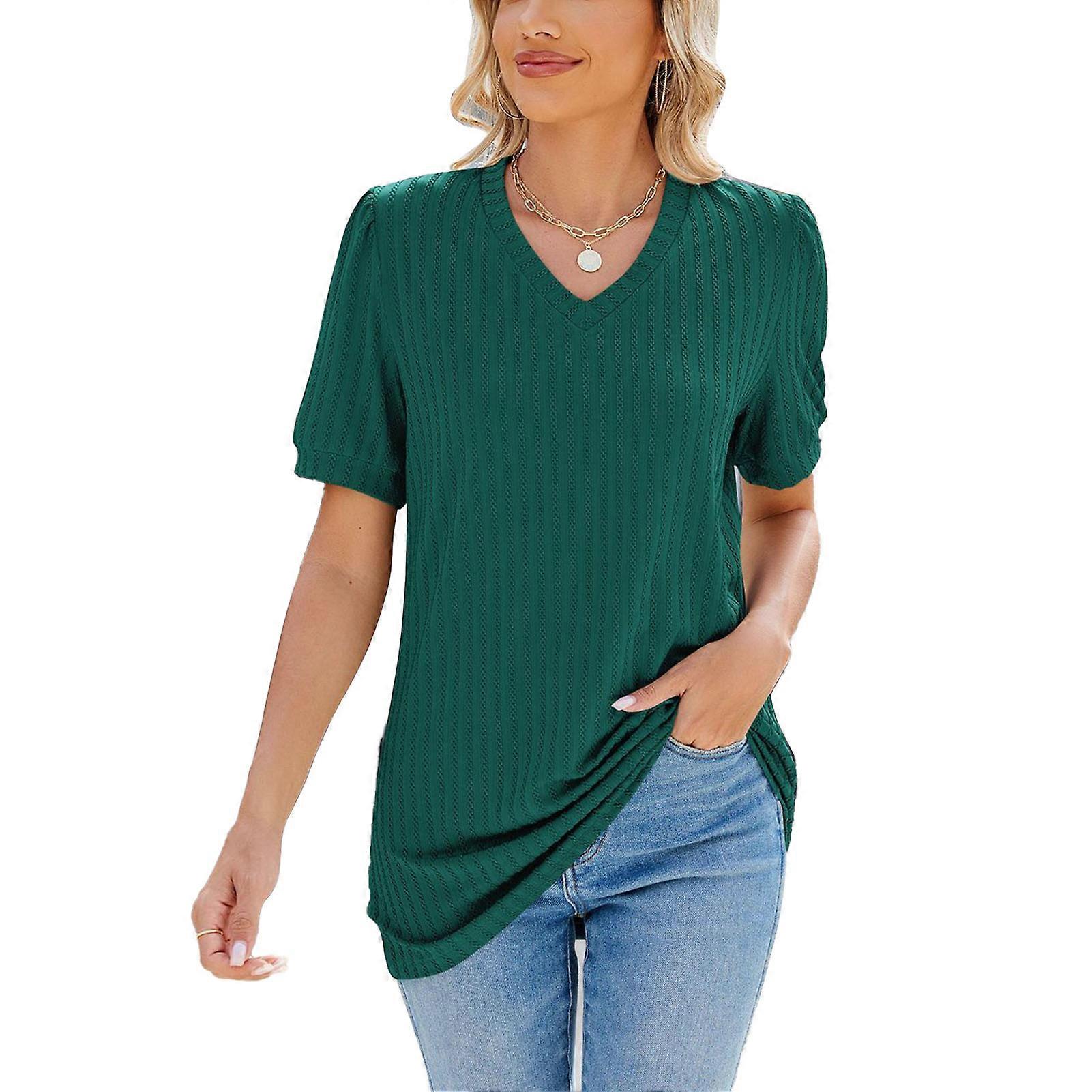 V Neck Stripe Print T Shirt Solid Color Office Travel Peacock Green L