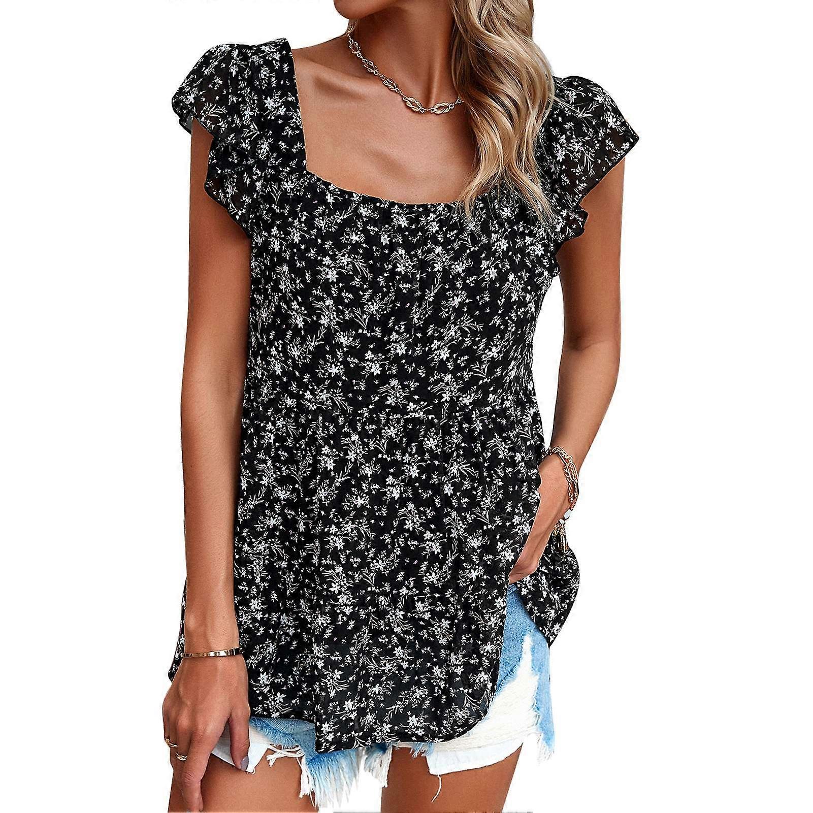 Women Ruffle Sleeveless Blouse Floral Printed Black L