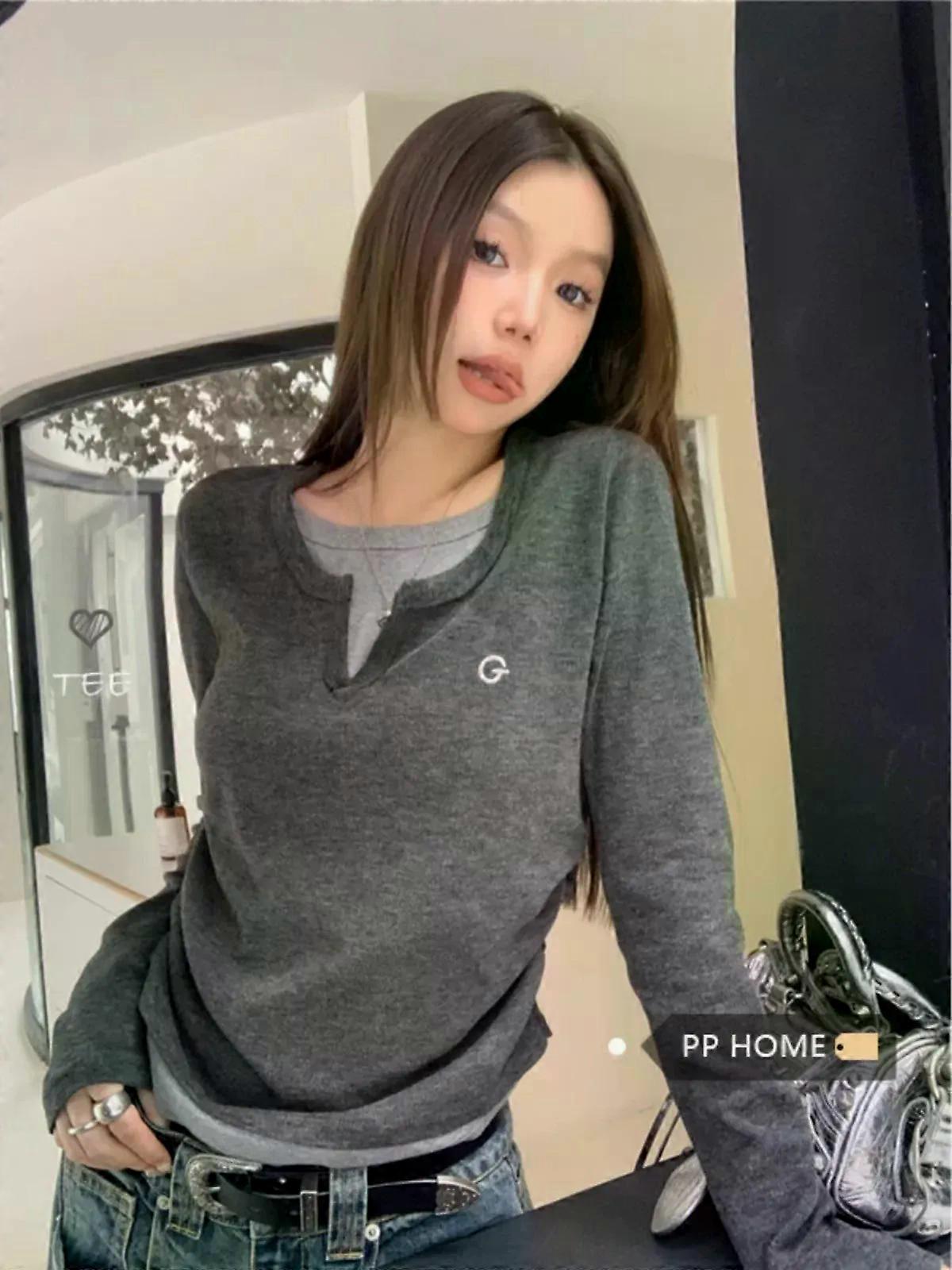 Women s T-shirt fake two piece long sleeved T-shirt for autumn and winter slim fit and slimming bottom top retro bottom top