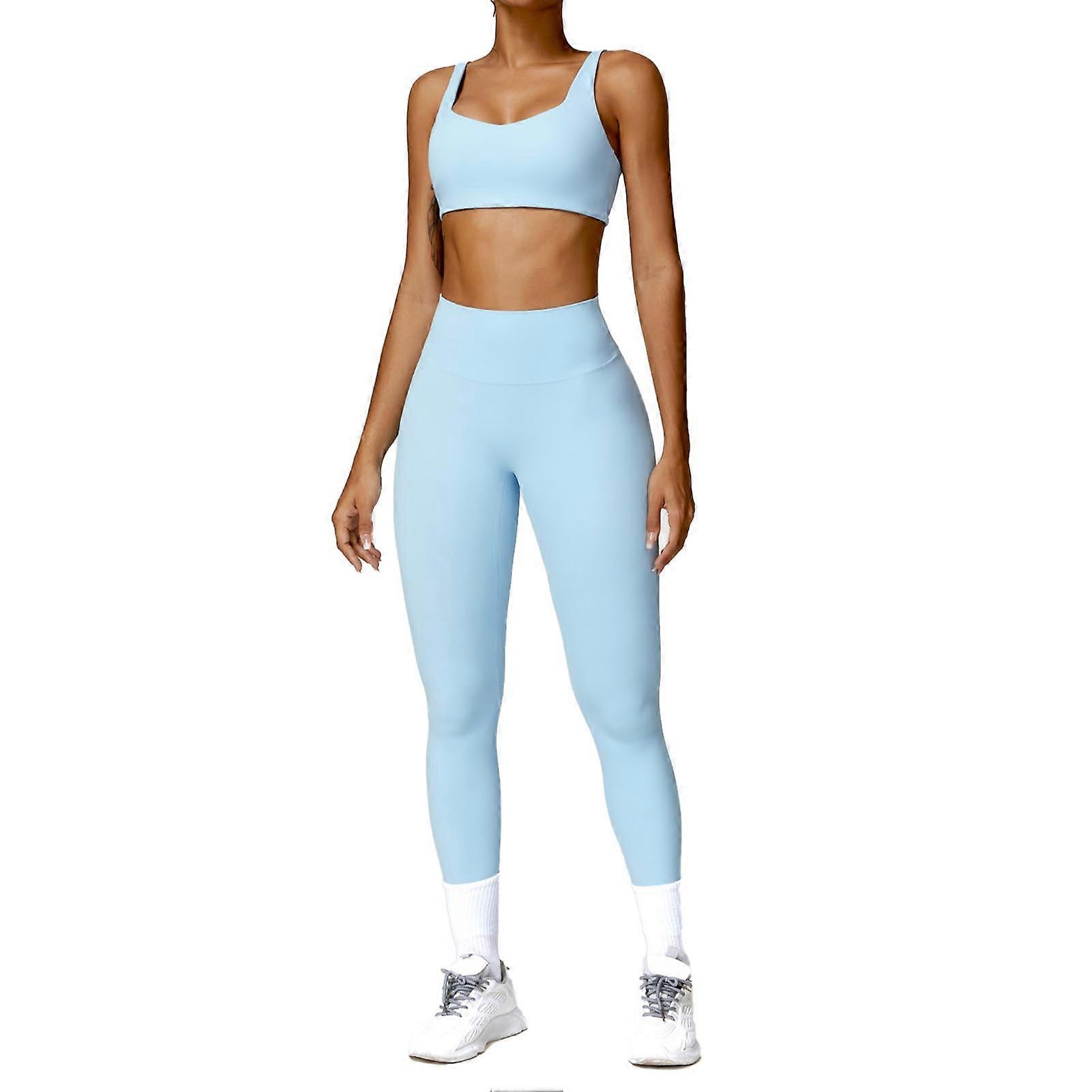 High Waist Leggings U Neck Bra Sweat Wicking Tummy Control Sky Blue M