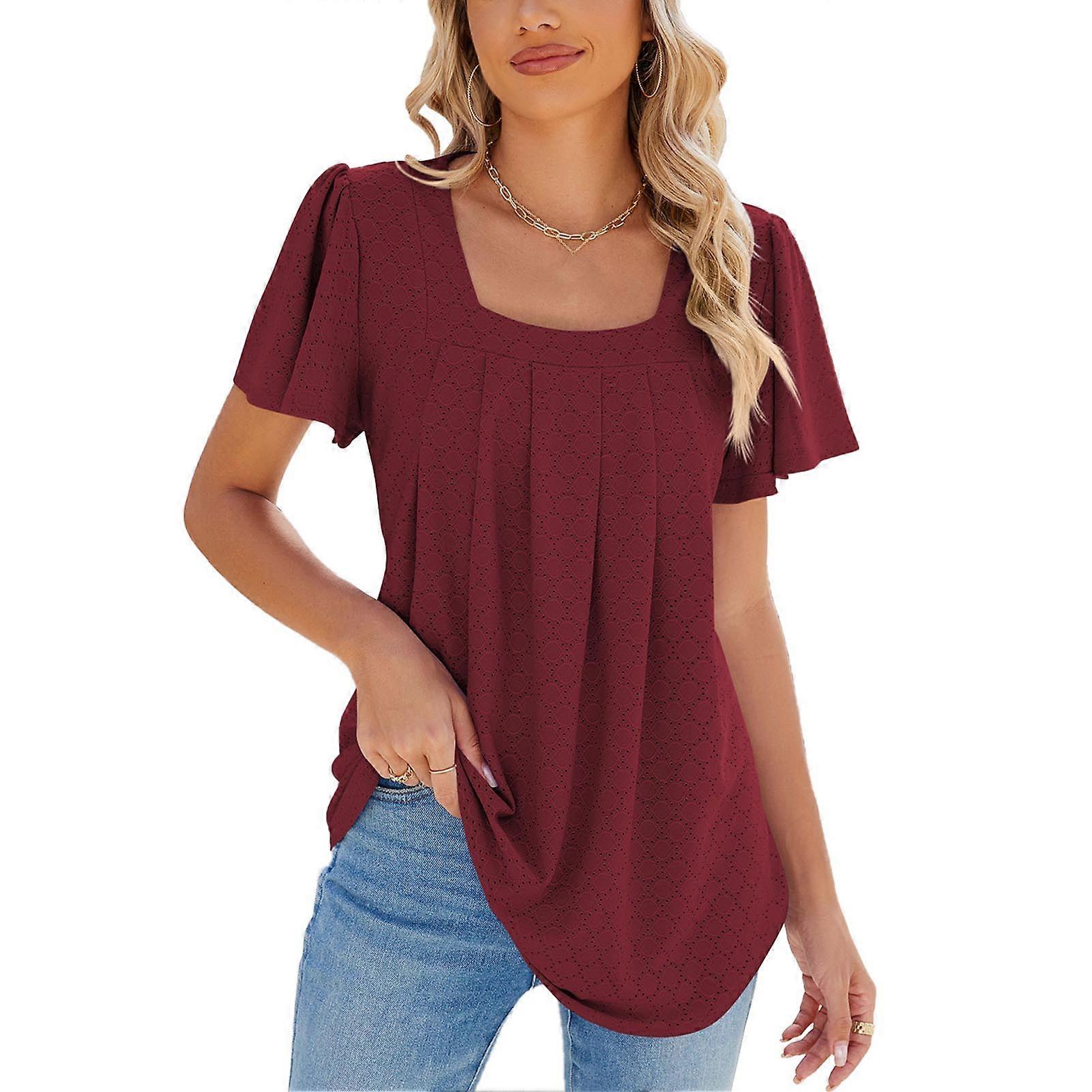 Women Ruffle Sleeve Blouse Loose Fit Breathable Tunic Top Wine Red L