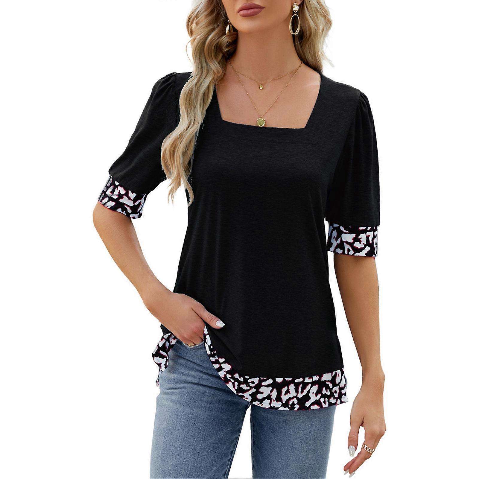 Women Print Color Block Puff Short Sleeve Side Split Black L