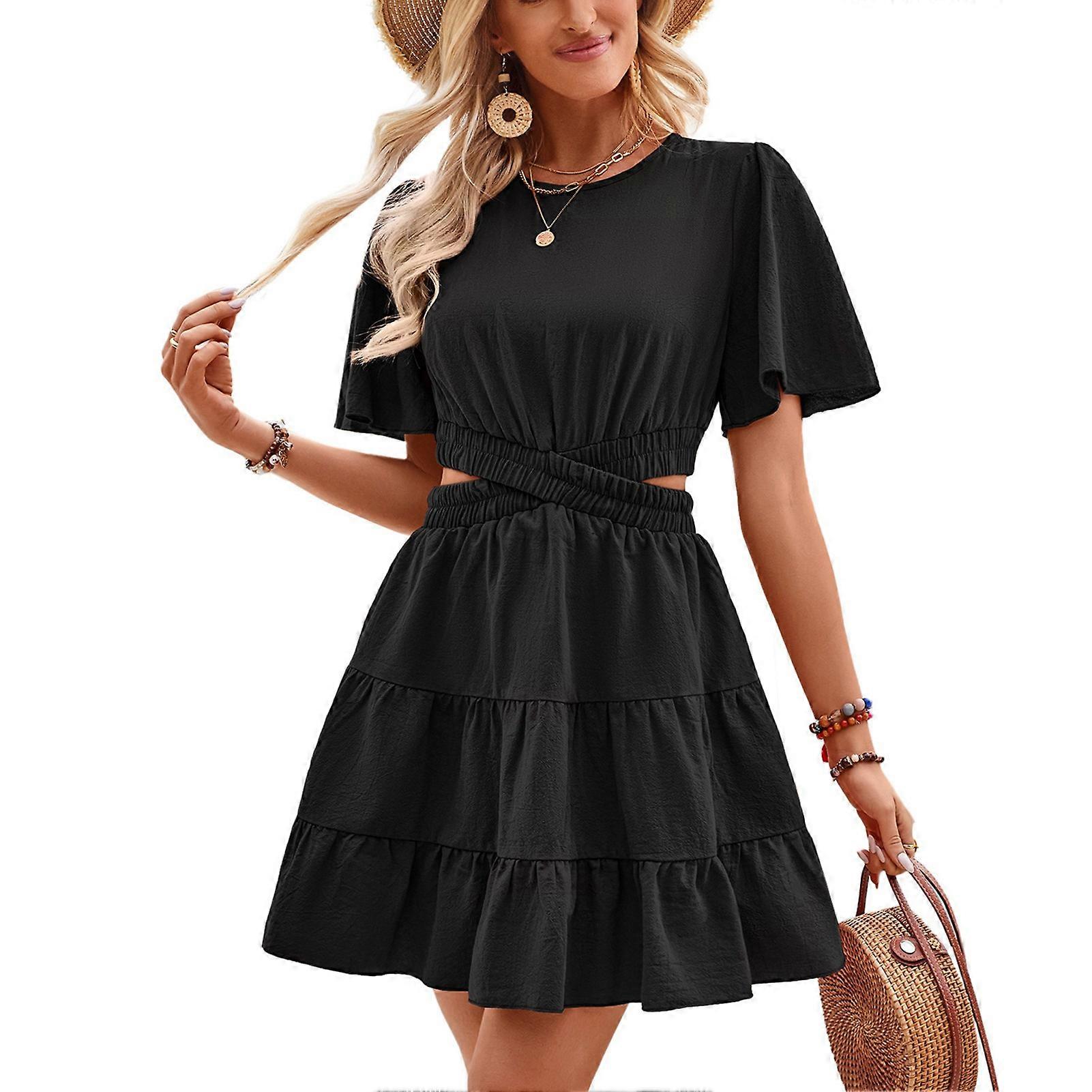 Women Cut Out Summer Dress Short Sleeve Crossover Waist Black L