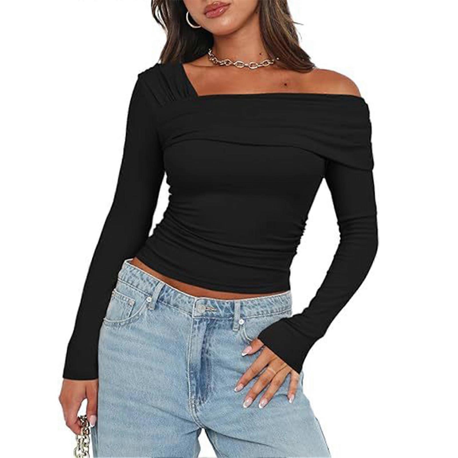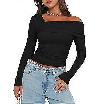 Off Shoulder Long Sleeve Top Ruched Slim Fit Polyester Black M