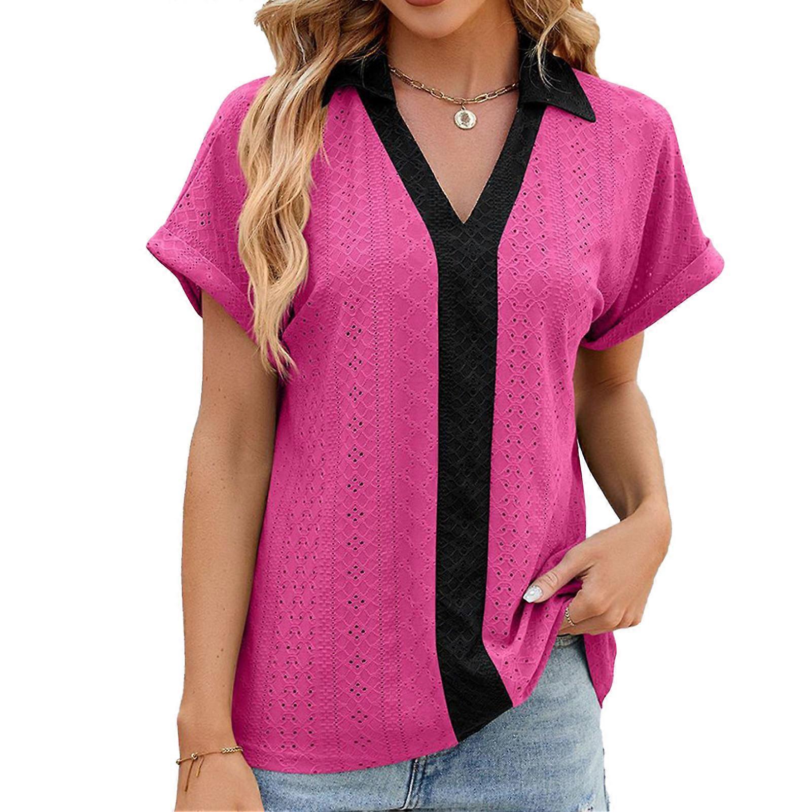 Color Block Blouse V Neck Short Sleeve Top Pink S