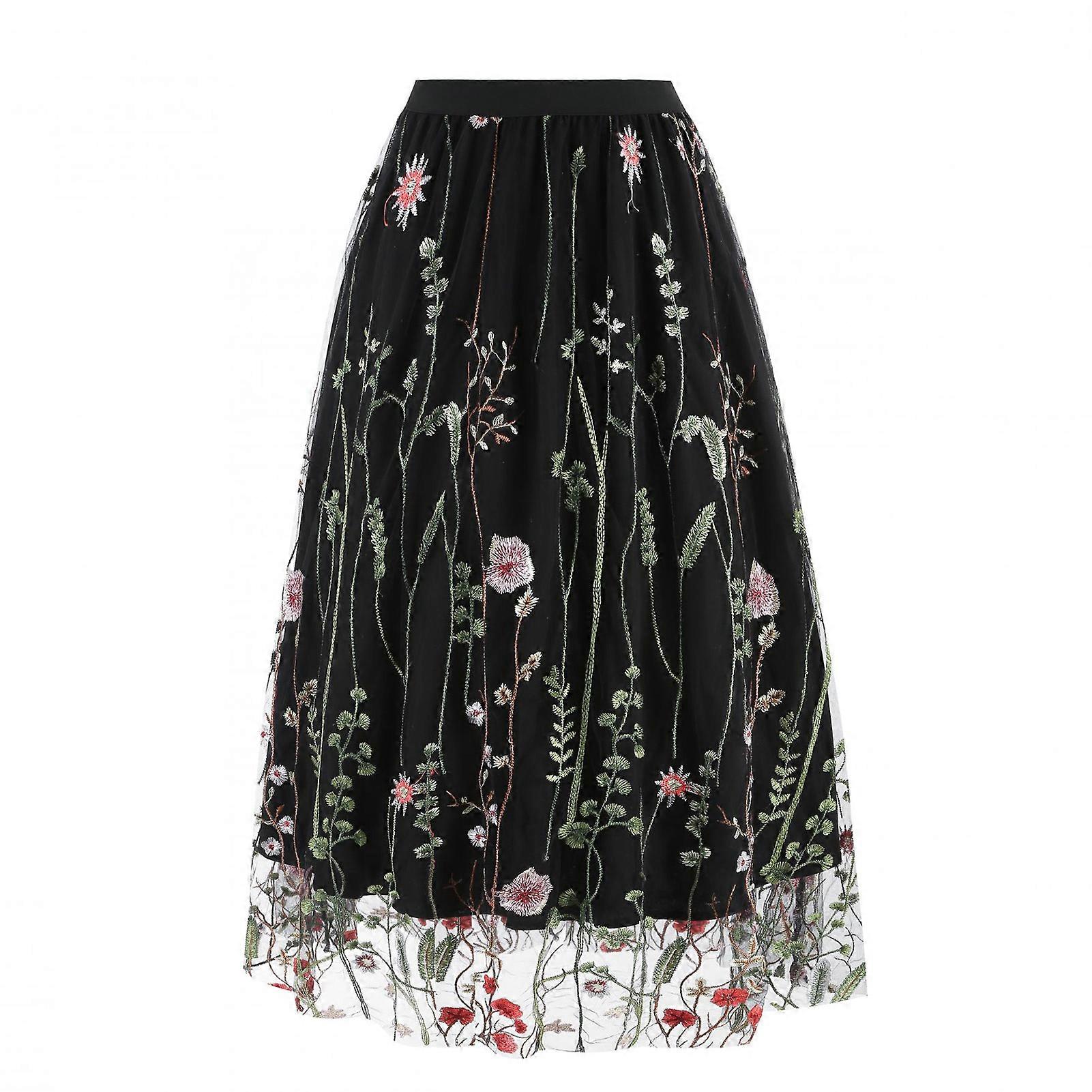Women Floral Embroidery Skirt Elastic Waist Black XXL
